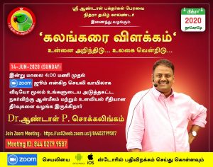 இன்று (14.06.2020) மாலை 4:00 மணி முதல் 6:30 மணி வரை ஜூம் என்கிற செயலி (Zoom App) வாயிலாக வீடியோ மூலம் “கலங்கரை விளக்கம் – உன்னை அறிந்திடு உலகை வென்றிடு” – உங்களுடைய அடுத்தகட்ட நகர்விற்கு ஆன்மீகம் மற்றும் உளவியல் ரீதியான தீர்வுகள் அளிக்க இருக்கின்றேன் விருப்பமுள்ளவர்கள் கலந்து கொள்ளவும்.
