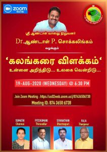 புதன்கிழமை (19.08.2020) மாலை 6:30 மணி முதல் 8:00 மணி வரை ஜூம் என்கிற செயலி (Zoom App) வாயிலாக வீடியோ மூலம் “கலங்கரை விளக்கம் – உன்னை அறிந்திடு உலகை வென்றிடு” என்கின்ற தலைப்பில் உங்களுடைய அடுத்தகட்ட நகர்விற்கும் ஆன்மீகம் மற்றும் உளவியல் ரீதியான கேள்விகளுக்கும் தீர்வுகளை அளிக்க இருக்கின்றார்கள் எங்களுடைய ஸ்ரீ ஆண்டாள் வாஸ்து நிபுணர்கள் மற்றும் ஸ்ரீ ஆண்டாள் வாஸ்து நிறுவனர் Dr.ஆண்டாள் P. சொக்கலிங்கம் அவர்கள்.