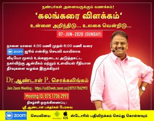 வரும் புதன்கிழமை (07.06.2020) மாலை 4:00 மணி முதல் 7:00 மணி வரை ஜூம் என்கிற செயலி (Zoom App) வாயிலாக வீடியோ மூலம் “கலங்கரை விளக்கம் – உன்னை அறிந்திடு உலகை வென்றிடு” – உங்களுடைய அடுத்தகட்ட நகர்விற்கு ஆன்மீகம் மற்றும் உளவியல் ரீதியான தீர்வுகள் அளிக்க இருக்கின்றேன் விருப்பமுள்ளவர்கள் கலந்து கொள்ளவும்.