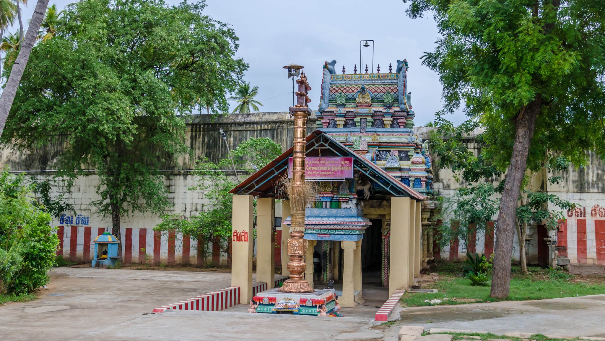 கிழக்கு நோக்கிய ஒரு முகப்பு வாயிலுடனும், சுற்றிலும் மதிற்சுவருடனும் இவ்வாலயம் குடமுருட்டியாற்றின் கரையில் அமைந்துள்ளது. முகப்பு வாயிலின் மேற்புறத்தில் சுதையாலான சிவனும், பார்வதியும் ரிஷபத்தின் மீது அமர்ந்தபடி காட்சி அளிக்கின்றனர். முகப்பு வாயிலைக் கடந்து உள்ளே சென்றால் விசாலமான கிழக்கு வெளிப் பிரகாரம் உள்ளது. இந்த வாயிலுக்கு நேரே உட்பிரகாரத்திற்குச் செல்லும் வாயில் உள்ளது. இந்த வாயிலுக்கு முன் பலிபீடமும், நந்தி மண்டபமும் உள்ளன. கொடிமரம் இல்லை. கருவறை, மற்றும் உட்பிரகாரமும் நான்கு புறமும் மதிற்சுவருடன் அமைந்துள்ளது. வெளிப் பிரகாரங்கள் நான்கு புறமும் விசாலமாக உள்ளன.