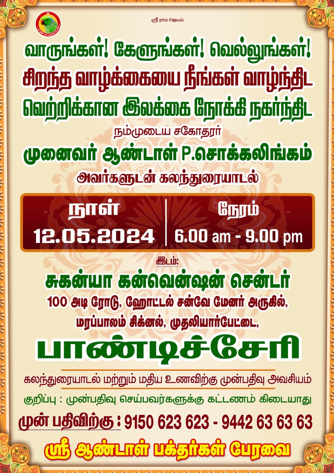 April 06 2024 0Commentவாருங்கள்! கேளுங்கள்! வெல்லுங்கள்! Posted by Vastu_Shastram In posters வாருங்கள்! கேளுங்கள்! வெல்லுங்கள்!Share this: Tags: #motivationalspeaker, AndalpChockalingam, DrAndalPChockalingam, Life, lifechallenge, lifechanging, lifestyle, lifetips, MoneyTips, Motivation, Motivation2024, MotivationalArticle, Motivationalspeech, Motivationoctober, Motivationtamil, pondicherrymeet, SABP, successful, Temples, Thesecret, thoughts, thoughtsoftheday, tipsforlife, சுகன்யாகன்வென்ஷன், பாண்டிச்சேரி, வாருங்கள்! கேளுங்கள்! வெல்லுங்கள்!, வெற்றிஇலக்கு Share: