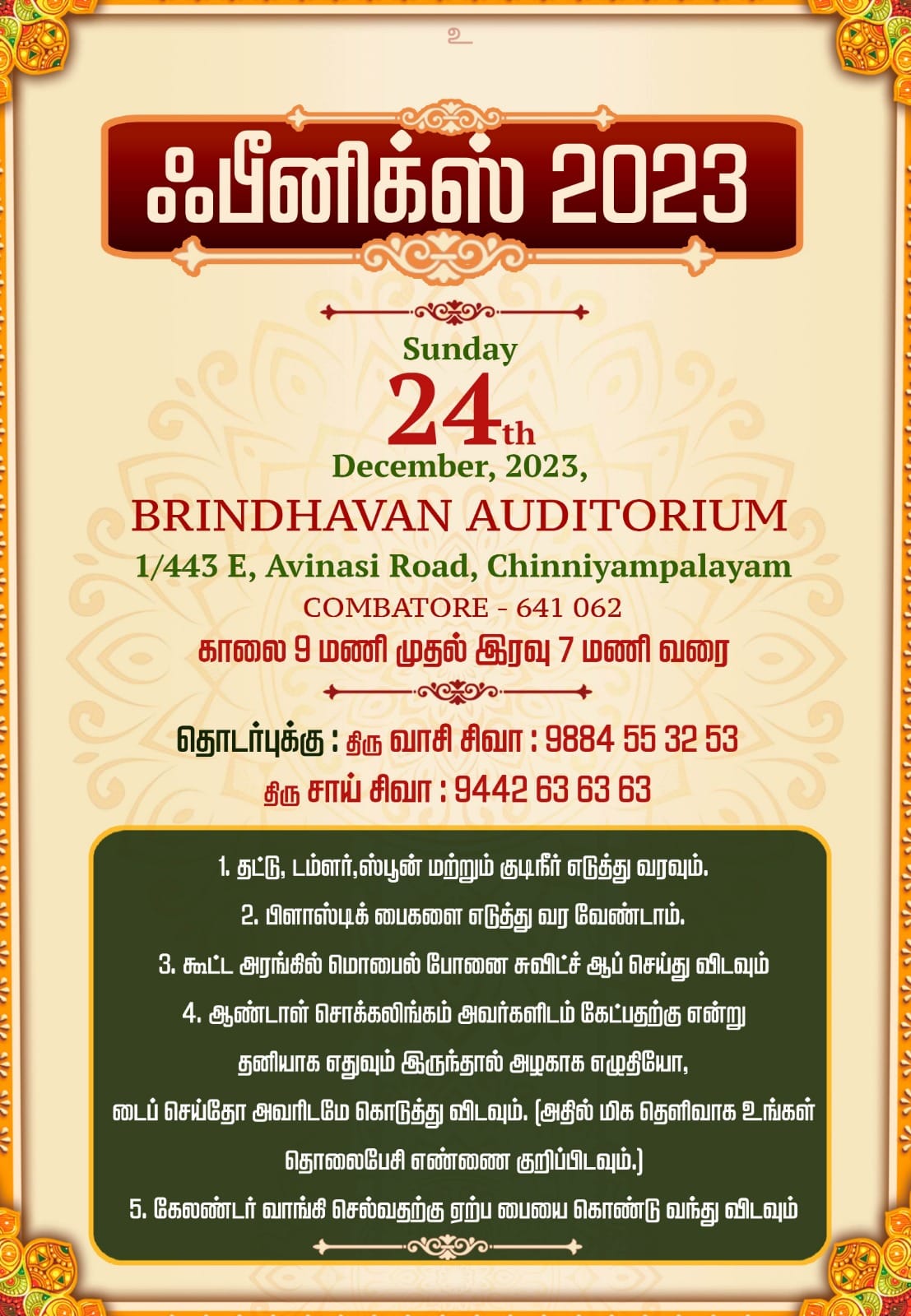 December 08 2023 0Commentஃபீனிக்ஸ் 2023 Posted by Vastu_Shastram In posters ஃபீனிக்ஸ் 2023Share this: Tags: #motivationalspeaker, AndalpChockalingam, bestfood, Brindhavan, brindhavanauditorium, Chinniyampalayam, coiambatoreprogram, DrAndalPChockalingam, farewell2023, feast, Life, lifechallenge, lifechanging, lifestyle, lifetips, MoneyTips, Motivation, Motivation2023, MotivationalArticle, Motivationalspeech, Motivationoctober, Motivationtamil, phoenix, SABP, successful, Thesecret, thoughts, thoughtsoftheday, tipsforlife, treat, ஃபீனிக்ஸ் 2023, பிருந்தாவன் Share: