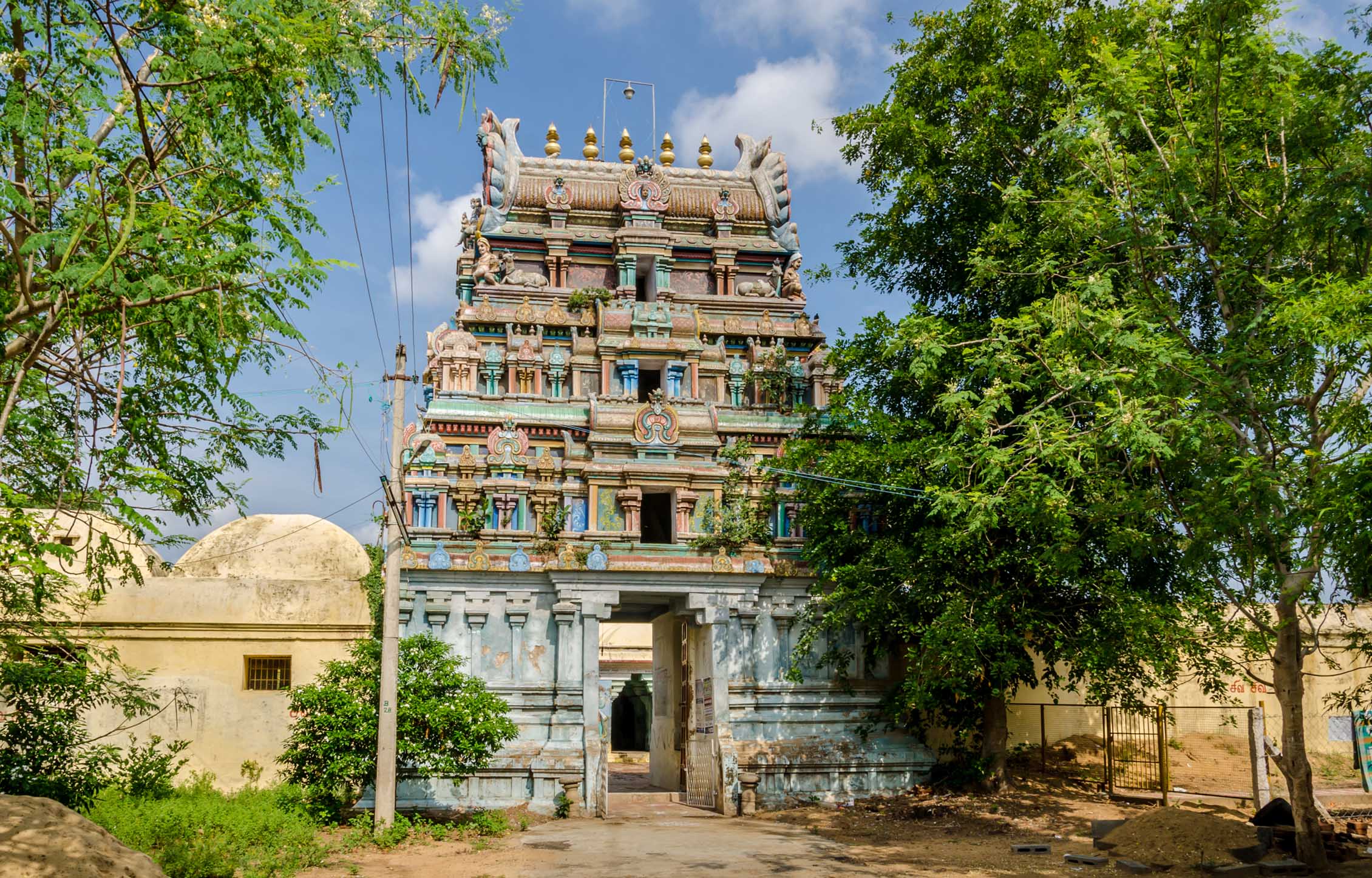 - மூன்று நிலைகள் கொண்ட கிழக்கு நோக்கிய ராஜகோபுரம் நம்மை வரவேற்கின்றது. உள்ளே சென்றதும் நேரே சுவாமி சந்நிதி தெரிகிறது. வலமாக வரும்போது விநாயகர் சந்நிதியுள்ளது. விசாலமான வெளிச் சுற்று. கோஷ்ட மூர்த்தங்களாகத் தட்சிணாமூர்த்தியும், பிரம்மா, விஷ்ணு உருவங்களும் உள்ளன.