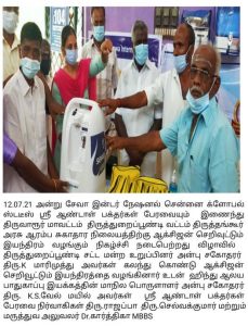 திரு.K மாரிமுத்து அவர்கள் கலந்து கொண்டு ஆக்சிஜன் செறிவூட்டும் இயந்திரத்தை வழங்கினார் உடன் ஹிந்து ஆலய பாதுகாப்பு இயக்கத்தின் மாநில பொருளாளர் அன்பு சகோதரர் திரு. K.S.வேல் மயில் அவர்கள் ஸ்ரீ ஆண்டாள் பக்தர்கள் பேரவை நிர்வாகிகள் திரு.ராஜப்பா திரு.செல்வக்குமார் மற்றும் மருத்துவ அலுவலர் Dr.கார்த்திகா MBBS.