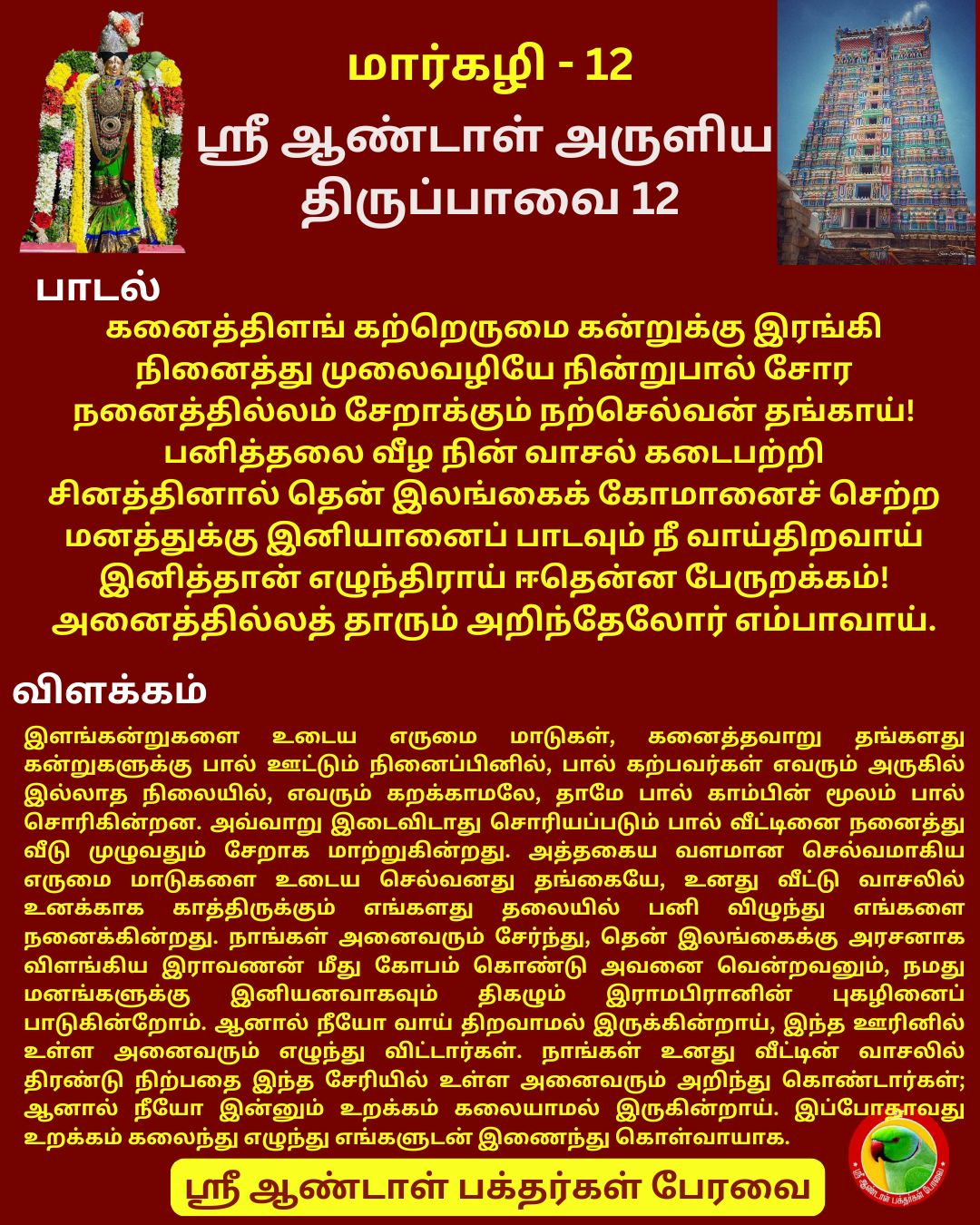 December 28 2024 0Commentஆண்டாள் தாயார் அருளிய திருப்பாவை பாசுரம் 12.. Posted by Vastu_Shastram In திருப்பாவை பாசுரம் ஆண்டாள் தாயார் அருளிய திருப்பாவை பாசுரம் 12..Share this: Tags: 99-வது திவ்யதேசம், 99th Divya Desam, DrAndalPChockalingam, Margazhi, Sri Andal Temple, Srivilliputhur, srivilliputhurandaltemple, Thirupaavai, அருள்மிகு ஆண்டாள் நாச்சியார் திருக்கோவில் வரலாறு, ஆண்டாள், ஆண்டாள் தாயார் அருளிய திருப்பாவை பாசுரம்1, இன்றைய திவ்ய தரிசனம், சயன திருக்கோலத்தில், தத்துவவிளக்கம், திருப்பாவை, திருப்பாவை பாசுரம், பாசுரம், பாசுரவிளக்கம், பாடல்வரிகள், பாவை நோன்பு, பெரியாழ்வார், மங்களாசாசனம், மார்கழி, வடபத்ரசாயி கோயிலில், ஸ்ரீ ஆண்டாள் தாயார், ஸ்ரீ ஆண்டாள் திருக்கோயில்., ஸ்ரீ ரெங்கமன்னார், ஸ்ரீபெரியபெருமாள், ஸ்ரீவில்லிபுத்தூ, ஸ்ரீவில்லிபுத்தூர், ஶ்ரீவில்லிபுத்தூர் Share: