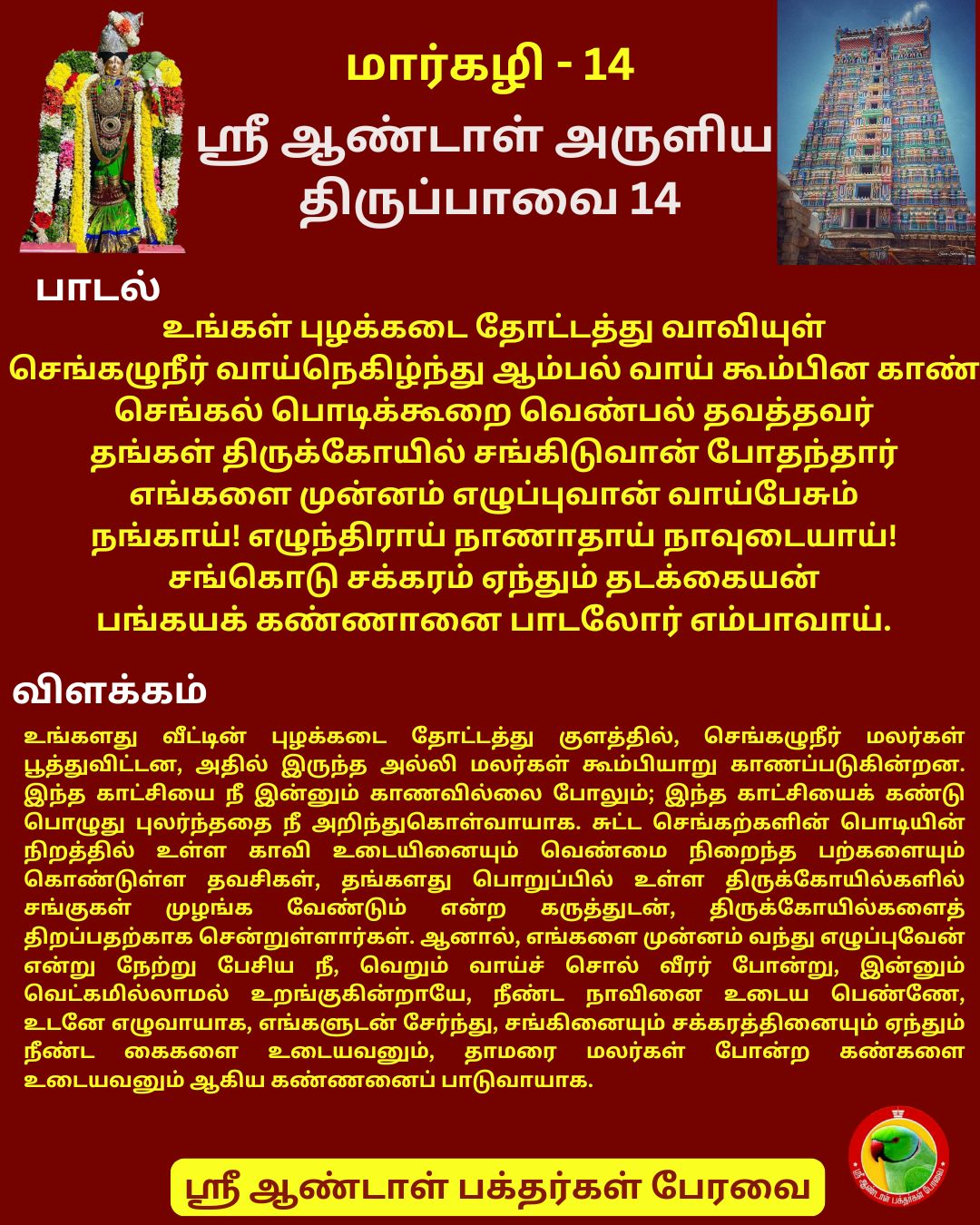 December 29 2024 0Commentஆண்டாள் தாயார் அருளிய திருப்பாவை பாசுரம் 14.. Posted by Vastu_Shastram In திருப்பாவை பாசுரம் ஆண்டாள் தாயார் அருளிய திருப்பாவை பாசுரம் 14..Share this: Tags: 99-வது திவ்யதேசம், 99th Divya Desam, DrAndalPChockalingam, Sri Andal Temple, Srivilliputhur, srivilliputhurandaltemple, அருள்மிகு ஆண்டாள் நாச்சியார் திருக்கோவில் வரலாறு, ஆண்டாள், ஆண்டாள் தாயார் அருளிய திருப்பாவை பாசுரம்1, இன்றைய திவ்ய தரிசனம், சயன திருக்கோலத்தில், தத்துவவிளக்கம், திருப்பாவை, பாசுரம், பாசுரவிளக்கம், பாடல்வரிகள், பெரியாழ்வார், பெரியாழ்வார் சுவாதி திருவிழா, மங்களாசாசனம், மார்கழி, வடபத்ரசாயி கோயிலில், ஸ்ரீ ஆண்டாள் தாயார், ஸ்ரீ ஆண்டாள் திருக்கோயில்., ஸ்ரீ ரெங்கமன்னார், ஸ்ரீபெரியபெருமாள், ஸ்ரீவில்லிபுத்தூ, ஸ்ரீவில்லிபுத்தூர், ஶ்ரீவில்லிபுத்தூர் Share: