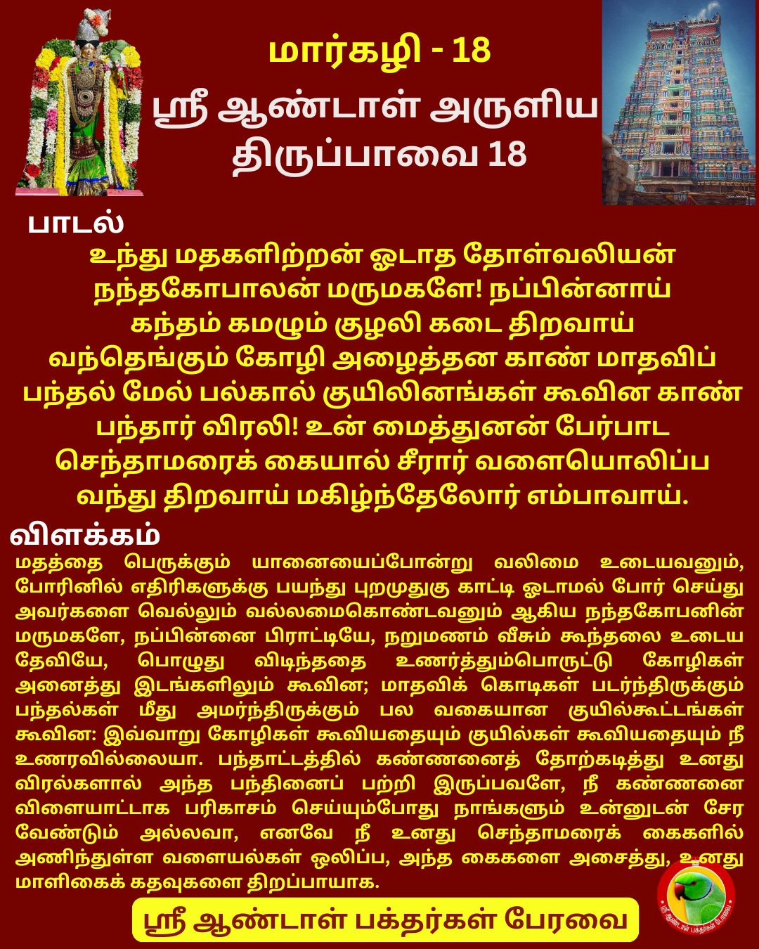 January 03 2025 0Commentஆண்டாள் தாயார் அருளிய திருப்பாவை பாசுரம் 18… Posted by Vastu_Shastram In திருப்பாவை பாசுரம் ஆண்டாள் தாயார் அருளிய திருப்பாவை பாசுரம் 18…Share this: Tags: 99-வது திவ்யதேசம், 99th Divya Desam, DrAndalPChockalingam, Margazhi, Sri Andal Temple, Srivilliputhur, srivilliputhurandaltemple, Thirupaavai, அருள்மிகு ஆண்டாள் நாச்சியார் திருக்கோவில் வரலாறு, ஆண்டாள், ஆண்டாள் தாயார் அருளிய திருப்பாவை பாசுரம்1, இன்றைய திவ்ய தரிசனம், சயன திருக்கோலத்தில், தத்துவவிளக்கம், திருப்பாவை, திருப்பாவை பாசுரம், பாசுரம், பாசுரவிளக்கம், பாடல்வரிகள், பாவை நோன்பு, பெரியாழ்வார், மங்களாசாசனம், மார்கழி, வடபத்ரசாயி கோயிலில், ஸ்ரீ ஆண்டாள் தாயார், ஸ்ரீ ஆண்டாள் திருக்கோயில்., ஸ்ரீ ரெங்கமன்னார், ஸ்ரீபெரியபெருமாள், ஸ்ரீவில்லிபுத்தூ, ஸ்ரீவில்லிபுத்தூர், ஶ்ரீவில்லிபுத்தூர் Share: