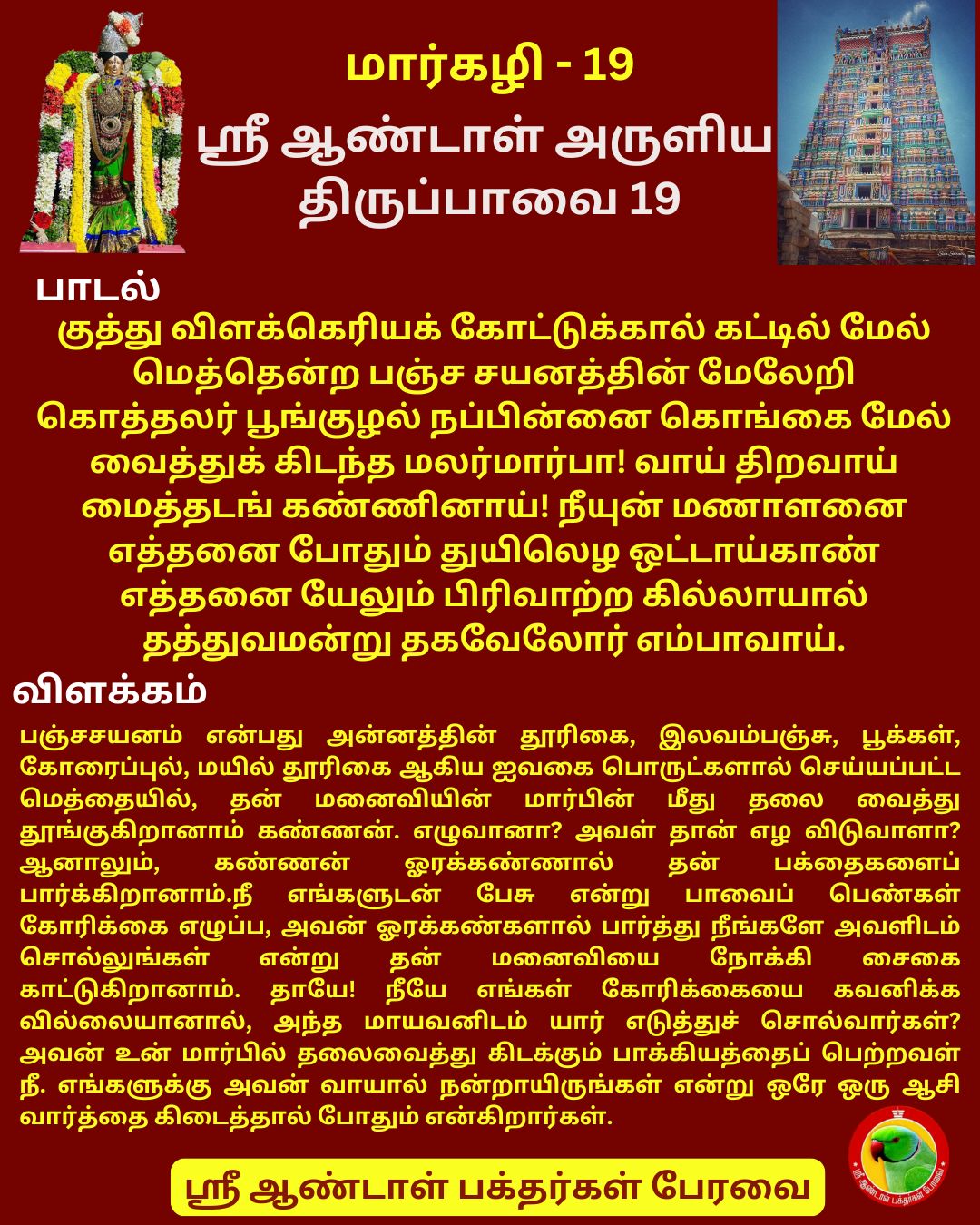January 03 2025 0Commentஆண்டாள் தாயார் அருளிய திருப்பாவை பாசுரம் 19… Posted by Vastu_Shastram In திருப்பாவை பாசுரம் ஆண்டாள் தாயார் அருளிய திருப்பாவை பாசுரம் 19…Share this: Tags: 99-வது திவ்யதேசம், 99th Divya Desam, DrAndalPChockalingam, Margazhi, Sri Andal Temple, Srivilliputhur, srivilliputhurandaltemple, Thirupaavai, அருள்மிகு ஆண்டாள் நாச்சியார் திருக்கோவில் வரலாறு, ஆண்டாள், ஆண்டாள் தாயார் அருளிய திருப்பாவை பாசுரம்1, இன்றைய திவ்ய தரிசனம், சயன திருக்கோலத்தில், தத்துவவிளக்கம், திருப்பாவை, திருப்பாவை பாசுரம், பாசுரம், பாசுரவிளக்கம், பாடல்வரிகள், பாவை நோன்பு, பெரியாழ்வார், மங்களாசாசனம், மார்கழி, வடபத்ரசாயி கோயிலில், ஸ்ரீ ஆண்டாள் தாயார், ஸ்ரீ ஆண்டாள் திருக்கோயில்., ஸ்ரீ ரெங்கமன்னார், ஸ்ரீபெரியபெருமாள், ஸ்ரீவில்லிபுத்தூ, ஸ்ரீவில்லிபுத்தூர், ஶ்ரீவில்லிபுத்தூர் Share: