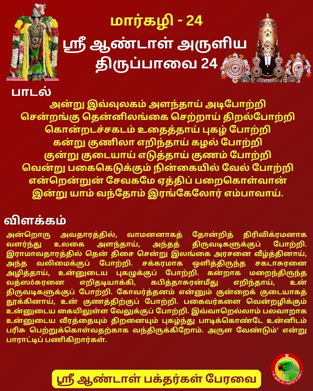 January 08 2025 0Commentஆண்டாள் தாயார் அருளிய திருப்பாவை பாசுரம் 24… Posted by Vastu_Shastram In திருப்பாவை பாசுரம் ஆண்டாள் தாயார் அருளிய திருப்பாவை பாசுரம் 24…Share this: Tags: 99-வது திவ்யதேசம், 99th Divya Desam, DrAndalPChockalingam, Sri Andal Temple, Srivilliputhur, srivilliputhurandaltemple, அருள்மிகு ஆண்டாள் நாச்சியார் திருக்கோவில் வரலாறு, ஆண்டாள், ஆண்டாள் தாயார் அருளிய திருப்பாவை பாசுரம்1, இன்றைய திவ்ய தரிசனம், சயன திருக்கோலத்தில், தத்துவவிளக்கம், திருப்பாவை, திருப்பாவை பாசுரம் 16, பாசுரம், பாசுரவிளக்கம், பாடல்வரிகள், பெரியாழ்வார், பெரியாழ்வார் சுவாதி திருவிழா, மங்களாசாசனம், மார்கழி, வடபத்ரசாயி கோயிலில், ஸ்ரீ ஆண்டாள் தாயார், ஸ்ரீ ஆண்டாள் திருக்கோயில்., ஸ்ரீ ரெங்கமன்னார், ஸ்ரீபெரியபெருமாள், ஸ்ரீவில்லிபுத்தூ, ஸ்ரீவில்லிபுத்தூர், ஶ்ரீவில்லிபுத்தூர் Share: