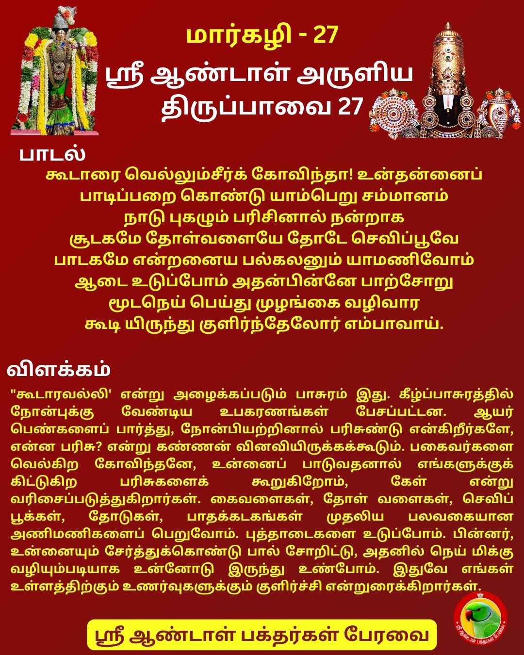 January 11 2025 0Commentஆண்டாள் தாயார் அருளிய திருப்பாவை பாசுரம் 27… Posted by Vastu_Shastram In திருப்பாவை பாசுரம் ஆண்டாள் தாயார் அருளிய திருப்பாவை பாசுரம் 27…Share this: Tags: 99-வது திவ்யதேசம், 99th Divya Desam, DrAndalPChockalingam, Sri Andal Temple, Srivilliputhur, srivilliputhurandaltemple, அருள்மிகு ஆண்டாள் நாச்சியார் திருக்கோவில் வரலாறு, ஆண்டாள், ஆண்டாள் தாயார் அருளிய திருப்பாவை பாசுரம்1, இன்றைய திவ்ய தரிசனம், சயன திருக்கோலத்தில், தத்துவவிளக்கம், திருப்பாவை, திருப்பாவை பாசுரம் 16, பாசுரம், பாசுரவிளக்கம், பாடல்வரிகள், பெரியாழ்வார், பெரியாழ்வார் சுவாதி திருவிழா, மங்களாசாசனம், மார்கழி, வடபத்ரசாயி கோயிலில், ஸ்ரீ ஆண்டாள் தாயார், ஸ்ரீ ஆண்டாள் திருக்கோயில்., ஸ்ரீ ரெங்கமன்னார், ஸ்ரீபெரியபெருமாள், ஸ்ரீவில்லிபுத்தூ, ஸ்ரீவில்லிபுத்தூர், ஶ்ரீவில்லிபுத்தூர் Share: