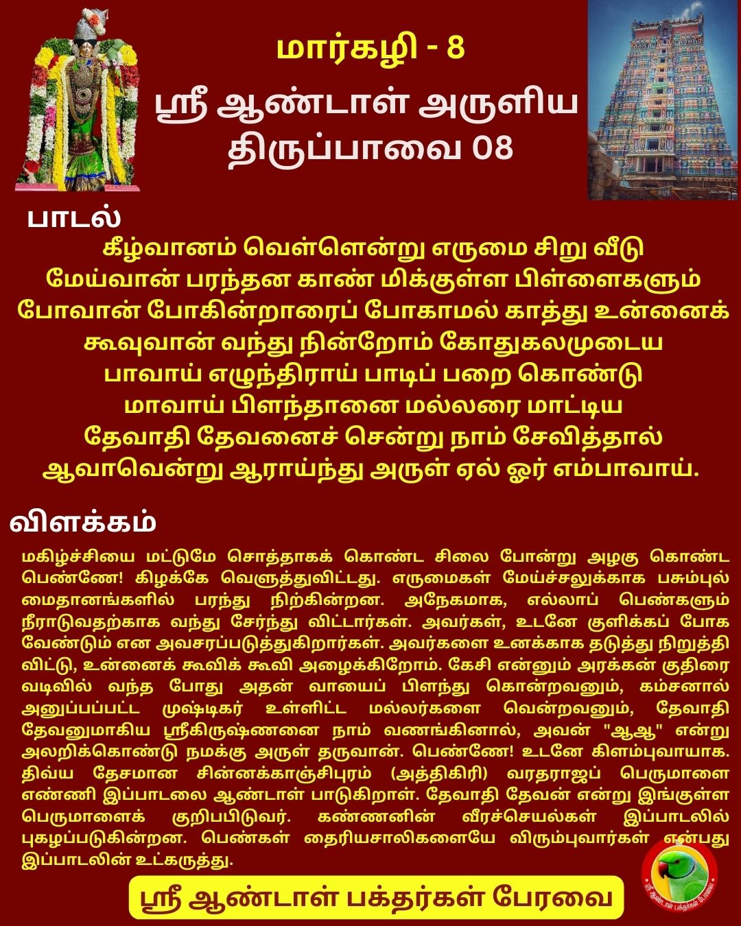 December 24 2024 0Commentஆண்டாள் தாயார் அருளிய திருப்பாவை பாசுரம் 8.. Posted by Vastu_Shastram In திருப்பாவை பாசுரம் ஆண்டாள் தாயார் அருளிய திருப்பாவை பாசுரம் 8..Share this: Tags: 99-வது திவ்யதேசம், 99th Divya Desam, DrAndalPChockalingam, Margazhi, Sri Andal Temple, Srivilliputhur, srivilliputhurandaltemple, Thirupaavai, அருள்மிகு ஆண்டாள் நாச்சியார் திருக்கோவில் வரலாறு, ஆண்டாள், ஆண்டாள் தாயார் அருளிய திருப்பாவை பாசுரம்1, இன்றைய திவ்ய தரிசனம், சயன திருக்கோலத்தில், தத்துவவிளக்கம், திருப்பாவை, திருப்பாவை பாசுரம், பாசுரம், பாசுரவிளக்கம், பாடல்வரிகள், பாவை நோன்பு, பெரியாழ்வார், மங்களாசாசனம், மார்கழி, வடபத்ரசாயி கோயிலில், ஸ்ரீ ஆண்டாள் தாயார், ஸ்ரீ ஆண்டாள் திருக்கோயில்., ஸ்ரீ ரெங்கமன்னார், ஸ்ரீபெரியபெருமாள், ஸ்ரீவில்லிபுத்தூ, ஸ்ரீவில்லிபுத்தூர், ஶ்ரீவில்லிபுத்தூர் Share: