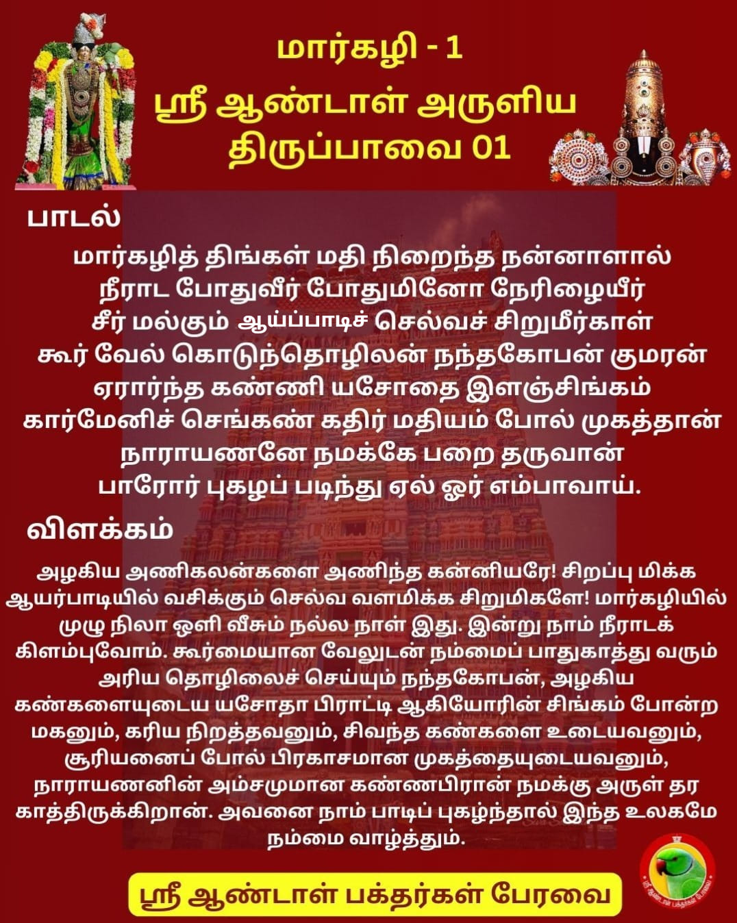 December 16 2024 0Commentஆண்டாள் தாயார் அருளிய திருப்பாவை பாசுரம்1 Posted by Vastu_Shastram In திருப்பாவை பாசுரம் ஆண்டாள் தாயார் அருளிய திருப்பாவை பாசுரம் 1 Share this: Tags: #motivationalspeaker, andaltiruppavai, DrAndalPChockalingam, Margazhi, MoneyTips, Motivationalspeech, PASURAM 1, SABP, Tiruppavai, ஆண்டாள், ஆண்டாள் அரங்கனை ஆண்டாள், ஆண்டாள் அருளிய திருப்பாவை, ஆண்டாள் தாயார் அருளிய திருப்பாவை பாசுரம்1, ஆண்டாள்திருப்பாவை, ஆயச்சி, ஆயர்கள், திருப்பாவை, திருப்பாவை விளக்கம், திருப்பாவைபாடல், பாசுரம் 1, பாவை நோன்பு, புள்ளின் வாய் கீண்டானைப் பொல்லா அரக்கனைக், மார்கழி நோன்பு, ஸ்ரீஆண்டாள்பக்தர்கள்பேரவை, ஸ்ரீவில்லிபுத்தூர் Share: