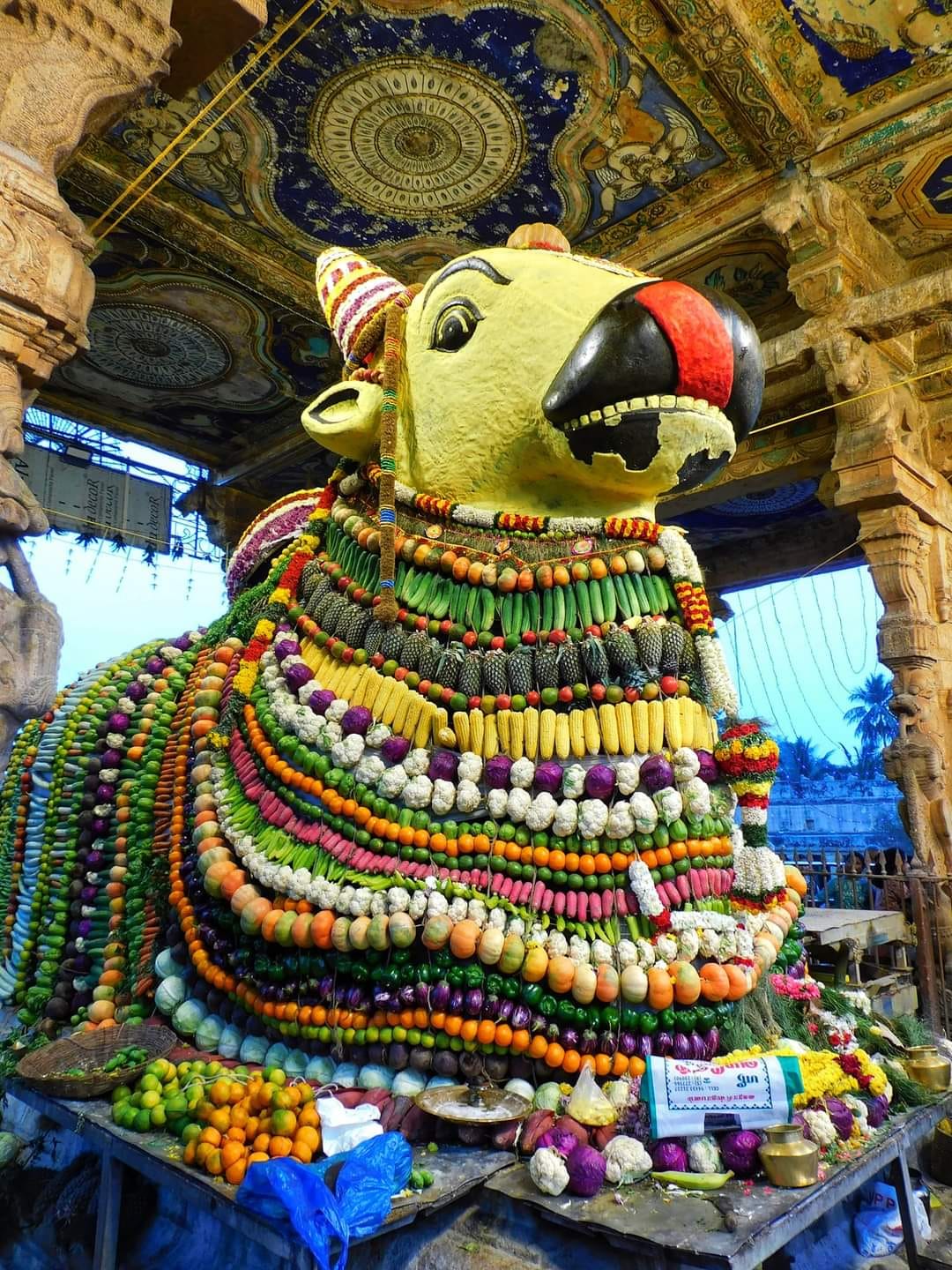 மாட்டுப் பொங்கலை முன்னிட்டு, தஞ்சை பெரியகோயில் மகா நந்திக்கு 2,000 கிலோ எடையிலான இனிப்பு வகைகள், பழங்கள், காய்கறிகளால் சிறப்பு அலங்காரம் செய்யப்பட்டது.