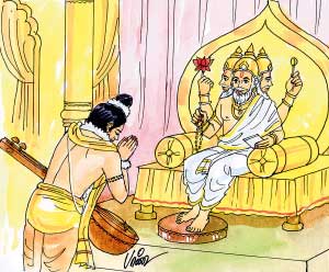 “”மனிதமனம் படுத்தும் பாடு இருக்கிறதே” என்று அதை எண்ணி வியந்திருக்கிறேன். உலகில் உள்ள எல்லோருக்கும் பாவ, புண்ணியம் பற்றிய சிந்தனைகள் எழாமல் இருப்பதில்லை. மக்கள் பாவச்செயல்களைச் செய்கிறார்கள். அதற்கான விளைவுகளையும் பெற்று துன்புறுகிறார்கள். புண்ணியங்களைச் செய்து நன்மைகளை அடைந்தாலும் நல்ல செயல்களைச் செய்யத் தயங்குகிறார்கள். பண்பான பேச்சினை விரும்புகிறார்கள். ஆனால், பிறர் மீது கோபம் கொள்கிறார்கள். தன்னிடம் மற்றவர்கள் உண்மையோடு நடந்து கொள்ள வேண்டும் என்று ஆசைப்பட்டாலும் உண்மையை விட்டு விலகி வெகுதூரத்தில் நிற்கிறார்கள். இப்படி மனித மனத்தின் கோணல்களை நினைத்து வியந்திருக்கிறேன்,”என்றார் நாரதர். “”இதற்கெல்லாம் தீர்வு ஏதாவது சொல்லேன்?”என்றார் பிரம்மா.