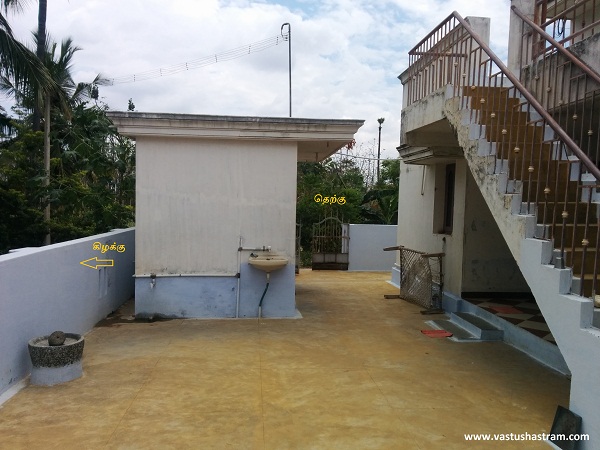 ஒரு மனையில் கட்டப்பட்டுள்ள கட்டிடத்தின் தென்கிழக்கு வெளிப்பகுதியில் தாய் சுவரையும் மதில் சுவரையும் தொடாமல் கழிவறை அமைக்க கூடாது. மேலும், ஒரு கட்டிடத்தில் தென்கிழக்கு பகுதியில் கழிவறை அமைப்பது தவறு.