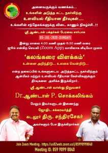 ஸ்ரீ ஆண்டாள் பக்தர்கள் பேரவை சார்பாக இன்று (05.07.2020) மாலை 4:00 மணி முதல் 6:30 மணி வரை ஜூம் என்கிற செயலி (Zoom App) வாயிலாக வீடியோ மூலம் “கலங்கரை விளக்கம் – உன்னை அறிந்திடு உலகை வென்றிடு” என்கின்ற தலைப்பில் உங்களுடைய அடுத்தகட்ட நகர்விற்கும் ஆன்மீகம் மற்றும் உளவியல் ரீதியான கேள்விகளுக்கும் தீர்வுகளை அளிக்க இருக்கிறார்..