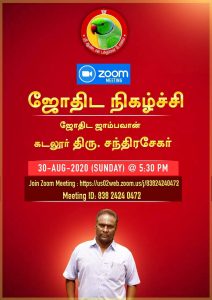 ஜோதிட நிகழ்ச்சி – கடலூர் திரு.சந்திரசேகர் Time: Aug 30, 2020 05:30 PM