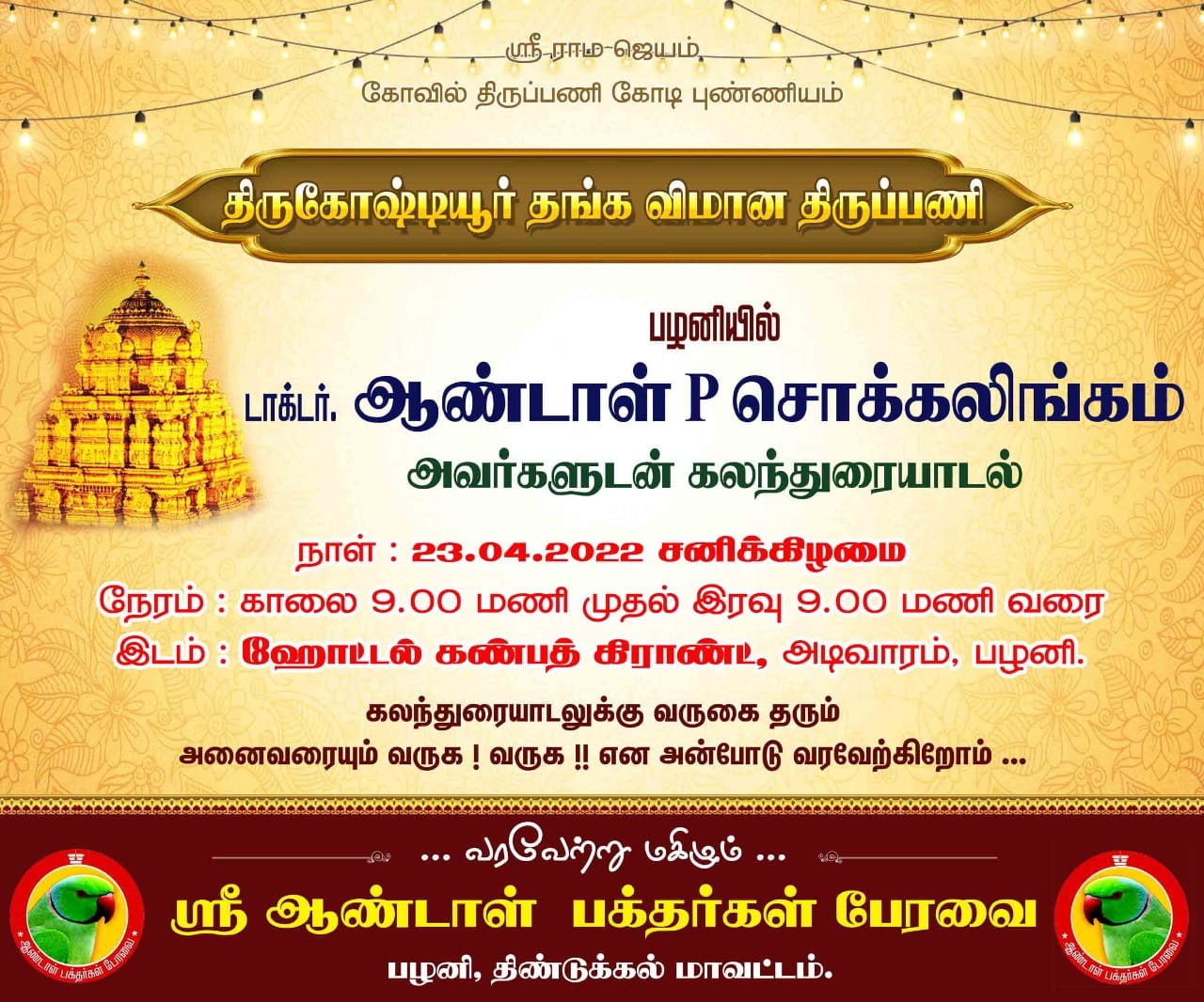 April 20 2022 0Commentதிருகோஷ்டியூர் தங்க விமான திருப்பணி பழநி Posted by Vastu_Shastram In posters திருகோஷ்டியூர் தங்க விமான திருப்பணி பழநி Share this: Tags: #Dr_Andal_P_Chockalingam, Gold, SABP, SAV, SriAandalVastu, thirukostiyur, சௌமியாநாராயணப்பெருமாள், தங்க விமான, தங்கம், தங்கவிமானம், திருகோஷ்டியூர், திருப்பணி, ஸ்ரீஆண்டாள்பக்தர்கள்பேரவை, ஸ்ரீஆண்டாள்வாஸ்து Share: