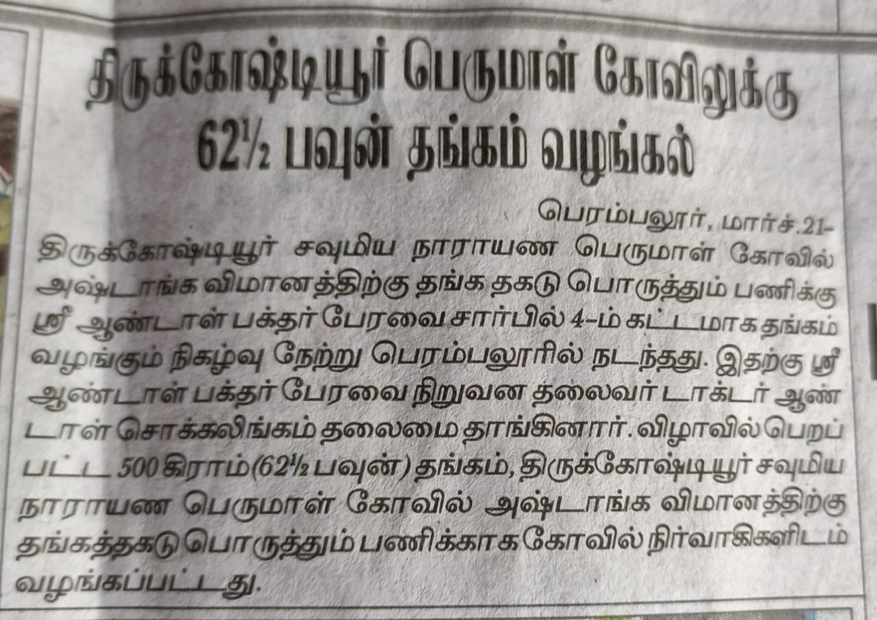 பெரம்பலூர், மார்ச்.21 திருக்கோஷ்டியூர் சௌமிய நாராயண பெருமாள் கோவில் அஷ்டாங்க விமானத்திற்கு தங்க தகடு பொருத்தும் பணிக்கு ஸ்ரீ ஆண்டாள் பக்தர்கள் பேரவை சார்பில் 4-ம் கட்டமாகதங்கம் வழங்கும் நிகழ்வு நேற்று பெரம்பலூரில் நடந்தது.