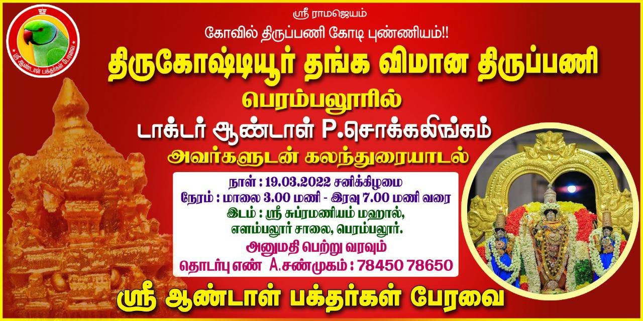 March 16 2022 0Commentதிருக்கோஷ்டியூர் தங்க விமானம் திருப்பணி Posted by Vastu_Shastram In திருக்கோஷ்டியூர் தங்க விமானம் திருக்கோஷ்டியூர் தங்க விமானம் திருப்பணிShare this: Tags: #Dr_Andal_P_Chockalingam, Gold, SABP, SAV, SriAandalVastu, thirukostiyur, சௌமியாநாராயணப்பெருமாள், தங்கம், தங்கவிமானம், திருப்பணி, ஸ்ரீஆண்டாள்பக்தர்கள்பேரவை, ஸ்ரீஆண்டாள்வாஸ்து Share: