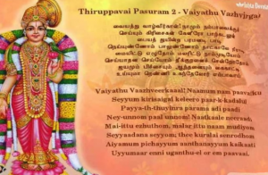 வையத்து வாழ்வீர்காள்! நாமும் நம் பாவைக்குச் செய்யும் கிரிசைகள் கேளீரோ பாற்கடலுள் பையத்துயின்ற பரமன் அடிபாடி நெய்யுண்ணோம் பாலுண்ணோம் நாட்காலே நீராடி மையிட்டு எழுதோம் மலரிட்டு நாம் முடியோம் செய்யாதன செய்யோம் தீக்குறளை சென்றோதோம் ஐயமும் பிச்சையும் ஆந்தனையும் கைகாட்டி உய்யுமா றெண்ணி உகந்தேலோர் எம்பாவாய்.