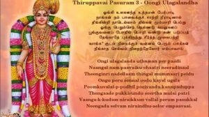 ஓங்கி உலகளந்த உத்தமன் பேர்பாடி நாங்கள் நம் பாவைக்கு சாற்றி நீராடினால் தீங்கின்றி நாடெல்லாம் திங்கள் மும்மாரி பெய்து ஓங்கு பெருஞ்செந்நெல் ஊடு கயலுகள பூங்குவளைப் போதில் பொறிவண்டு கண்படுப்ப தேங்காதே புக்கிருந்து சீர்த்த முலை பற்றி வாங்கக் குடம் நிறைக்கும் வள்ளல் பெரும்பசுக்கள் நீங்காத செல்வம் நிறைந்தேலோர் எம்பாவாய்.