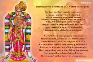 (கதவை திறக்க) நோற்றுச் சுவர்க்கம் புகுகின்ற அம்மனாய்! மாற்றமும் தராரோ? வாசல் திறவாதார் நாற்றத் துழாய்முடி நாராயணன் நம்மால் போற்றப் பறைதரும் புண்ணியனால் பண்டொருநாள் கூற்றத்தின் வாய்வீழ்ந்த கும்பகர்ணனும் தோற்றும் உனக்கே பெருந்துயில் தந்தானோ? ஆற்ற அனந்தல் உடையாய்! அருங்கலமே! தேற்றமாய் வந்து திறவேலோர் எம்பாவாய்.