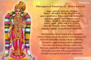 (விழித்து எழுக) கற்றுக் கறவைக் கணங்கள் பலகறந்து செற்றார் திறலழியச் சென்று செருகச் செய்யும் குற்றமொன்றில்லாத கோவலர் தம் பொற்கொடியே புற்றரவு அல்குல் புனமயிலே போதராய் சுற்றத்துத் தோழிமார் எல்லாரும் வந்துநின் முற்றம் புகுந்து முகில்வண்ணன் பேர் சிற்றாதே பேசாதே செல்வப்பெண்டாட்டி! நீ எற்றுக்கு உறங்கும் பொருளேலோர் எம்பாவாய்.