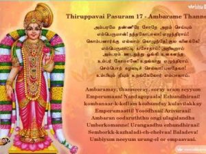 (கண்ணன் குடும்பத்தவரை எழுப்புதல்) அம்பரமே தண்ணீரே சோறே அறஞ்செய்யும் எம்பெருமான் நந்தகோபாலா! எழுந்திராய் கொம்பனார்க்கு எல்லாம் கொழுந்தே! குலவிளக்கே! எம்பெருமாட்டி யசோதாய்! அறிவுறாய்! அம்பரம் ஊடறுத்து ஓங்கி உலகளந்த உம்பர்கோமானே! உறங்காது எழுந்திராய் செம்பொற் கழலடிச் செல்வா! பலதேவா! உம்பியும் நீயும் உறங்கலோர் எம்பாவாய்.