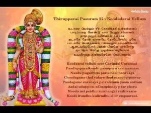 (மகிழ்ச்சி கொளல்) கூடாரை வெல்லும்சீர்க் கோவிந்தா! உன்தன்னைப் பாடிப்பறை கொண்டு யாம்பெறு சம்மானம் நாடு புகழும் பரிசினால் நன்றாக சூடகமே தோள்வளையே தோடே செவிப்பூவே பாடகமே என்றனைய பல்கலனும் யாமணிவோம் ஆடை உடுப்போம் அதன்பின்னே பாற்சோறு மூடநெய் பெய்து முழங்கை வழிவார கூடி யிருந்து குளிர்ந்தேலோர் எம்பாவாய்.