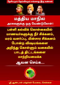 பள்ளி கல்வி கொள்கையில் மாணவர்களுக்கு நீர் சிக்கனம், மரம் வளர்ப்பு, மின்சார சிக்கனம், போன்ற விஷயங்களை அறிந்து கொள்ளும் வகையில் பாடத்திட்டங்களை மாற்றியமைக்க ஆவன  செய்க…..