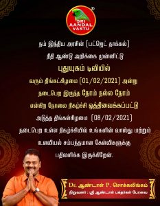 நம் இந்திய அரசின் (பட்ஜெட் தாக்கல்) ‘நிதி ஆண்டு அறிக்கை ‘ முன்னிட்டு புதுயுகம் டிவியில் வரும் திங்கட்கிழமை அன்று(01.02.2021)நடைபெற இருந்த “நேரம் நல்ல நேரம் “என்கின்ற நேரலை நிகழ்ச்சி ஒத்திவைக்கப்பட்டு அடுத்த திங்கள் கிழமை(08.02.2021) நடைபெற உள்ள நிகழ்ச்சியில் உங்களின் வாஸ்து மற்றும் உளவியல் சம்பந்தமான கேள்விகளுக்கு பதிலளிக்க இருக்கின்றேன். Dr.ஆண்டாள் பி சொக்கலிங்கம்