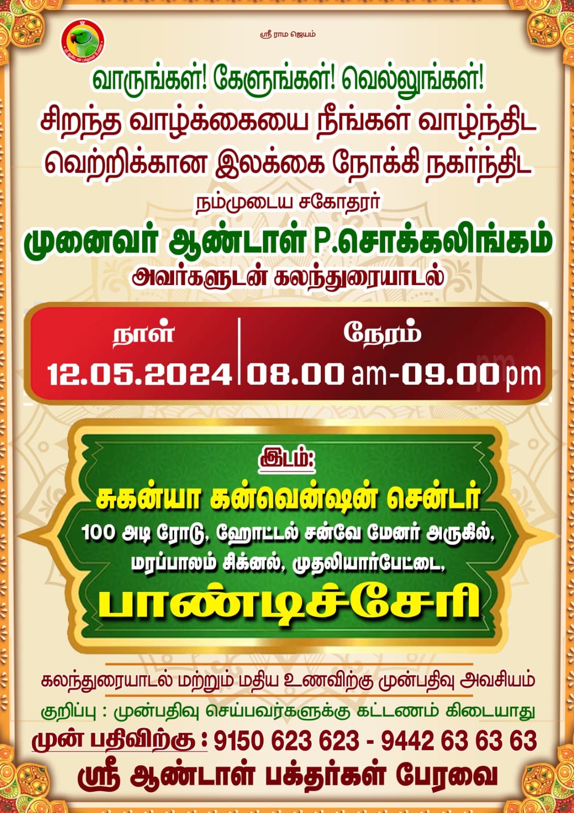 April 30 2024 0Commentவெற்றிக்கான இலக்கை நோக்கி நகர்ந்திட Posted by Vastu_Shastram In posters சிறந்த வாழ்க்கையை நீங்கள் வாழ்ந்திட வெற்றிக்கான இலக்கை நோக்கி நகர்ந்திடவாருங்கள்! கேளுங்கள்! வெல்லுங்கள்!Share this: Tags: #motivationalspeaker, AndalpChockalingam, DrAndalPChockalingam, Life, lifechallenge, lifechanging, lifestyle, lifetips, May12th, MoneyTips, Motivation, Motivation2024, MotivationalArticle, Motivationalspeech, Motivationtamil, pondicherry, pondicherrymeet, SABP, successful, Temples, Thesecret, thoughts, thoughtsoftheday, tipsforlife, சுகன்யாகன்வென்ஷன், பாண்டிச்சேரி, வாருங்கள்! கேளுங்கள்! வெல்லுங்கள்! Share: