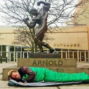 தன்னுடைய வெண்கலச் சிலைக்கு முன் உறங்கிய புகழ்பெற்ற ஹாலிவுட் ஹீரோ (ArnoldSchwarzenegger)அர்னால்டின் பரிதாப நிலை