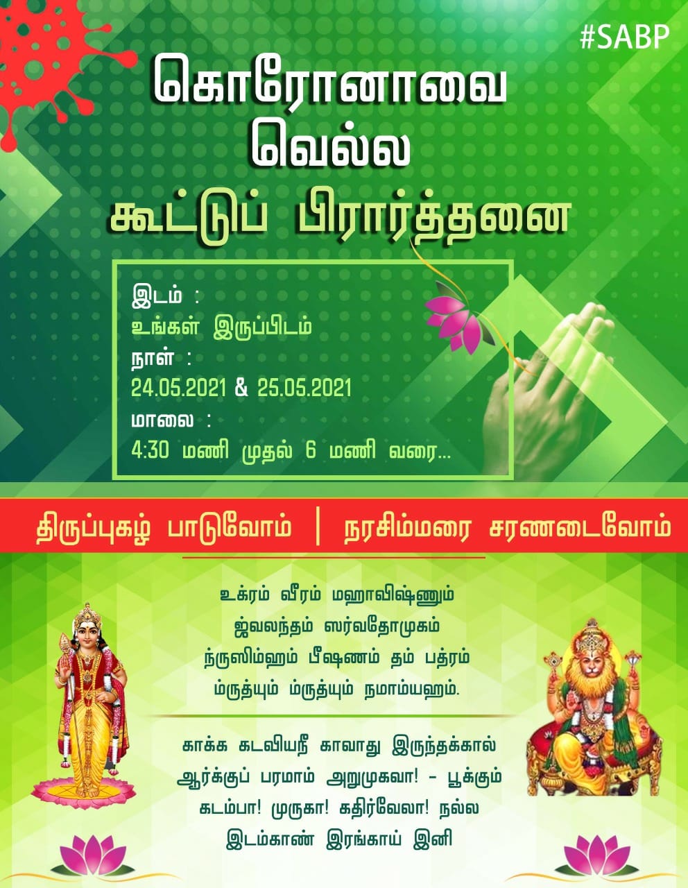 #ஆண்டாள் பக்தர்கள் பேரவை சார்பாக கூட்டு பிராத்தனை. அனைவரும் அவர் அவர் இல்லங்களில் இருந்து நம் உள்ளங்களில் முருகப்பெருமானையும், நரசிம்ம பெருமாளையும் வேண்டுவோம். வைகாசி விசாகமும் நரசிம்மர் ஜெயந்தியும் சேர்ந்து ஒரே நாளில் வருகிறது மிகவும் விசேஷமாக. 24.05.2021 ம் தேதி பிரதோஷம் உலகை காக்க ஆலகால விஷம் உண்ட ஈசனை வேண்டுவோம் தீவினை வந்து மக்களை தீண்டாமல் இருக்க. 25.05.2021 ம் தேதி வைத்தியனுக்கு எல்லாம் வைத்தியன் முத்து குமரனை சரணடைந்து வேண்டுவோம் வைகாசி விசாகத்தில். […]
