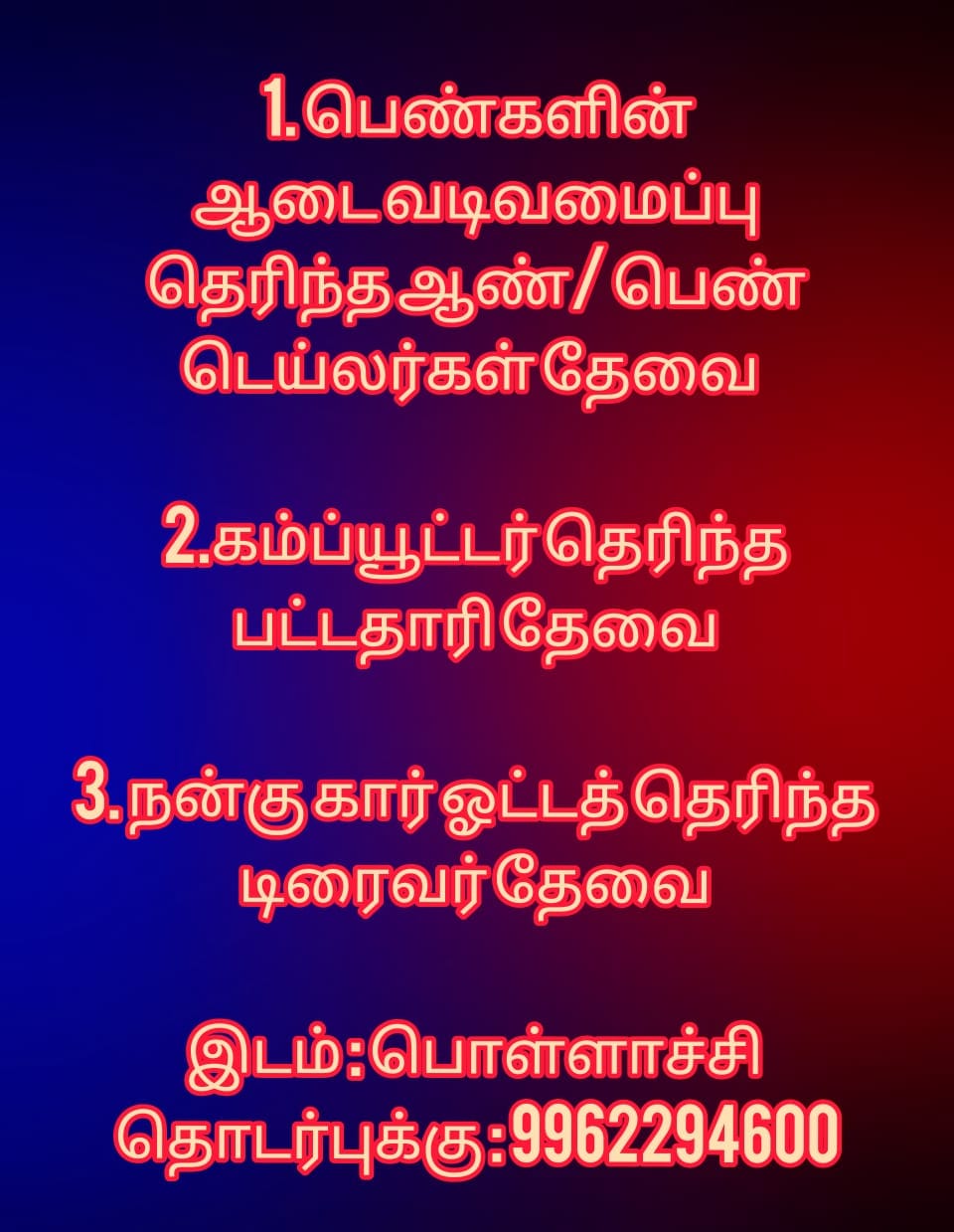 ஆட்கள் தேவை: 1. பெண்களின் ஆடை வடிவமைப்பு தெரிந்த ஆண்/ பெண் டெய்லர்கள் தேவை 2.கம்ப்யூட்டர் தெரிந்த பட்டதாரி தேவை 3. நன்கு கார் ஓட்டத் தெரிந்த டிரைவர் தேவை இடம் : பொள்ளாச்சி தொடர்புக்கு : 9962294600