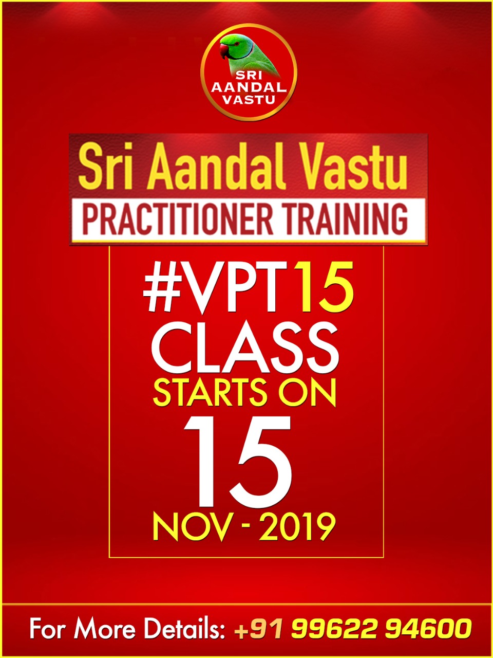 New batch starts on Sri Aandal Vastu Practitioner Training VPT 15 on November 15.. For more details : Contact 9962294600.