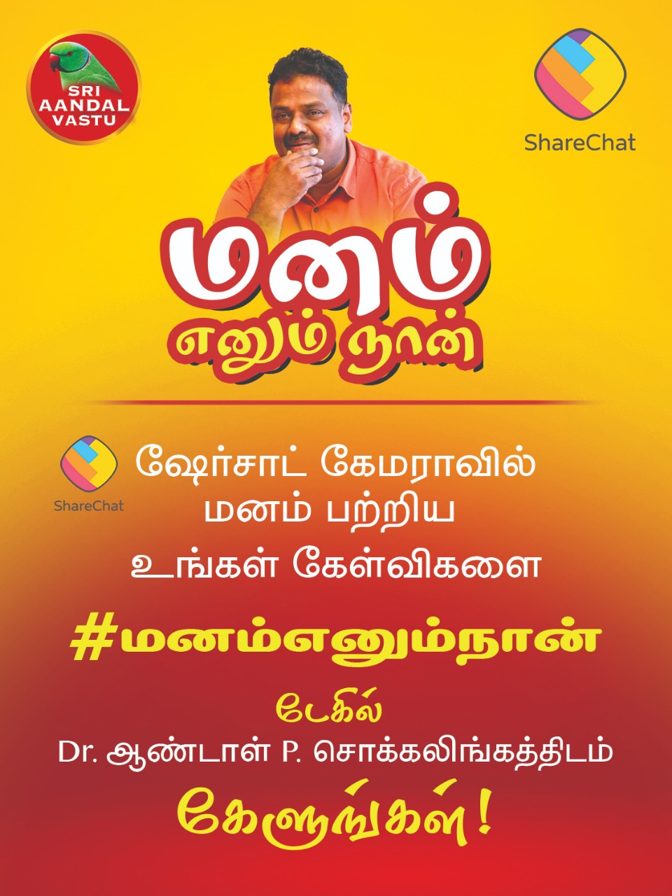 மனம் சம்பந்தப்பட்ட அனைத்து சந்தேகங்களையும்/உளவியல் சம்பந்தப்பட்ட அனைத்து கேள்விகளையும் ஷேர் சாட் கேமராவில் கேளுங்கள்!! #மனம்எனும்நான் Tagஇன் மூலமாக உங்கள் கேள்விகளை ஷேர்சட் கேமராவில் பதிவு செய்து போஸ்ட் செய்யவும்.