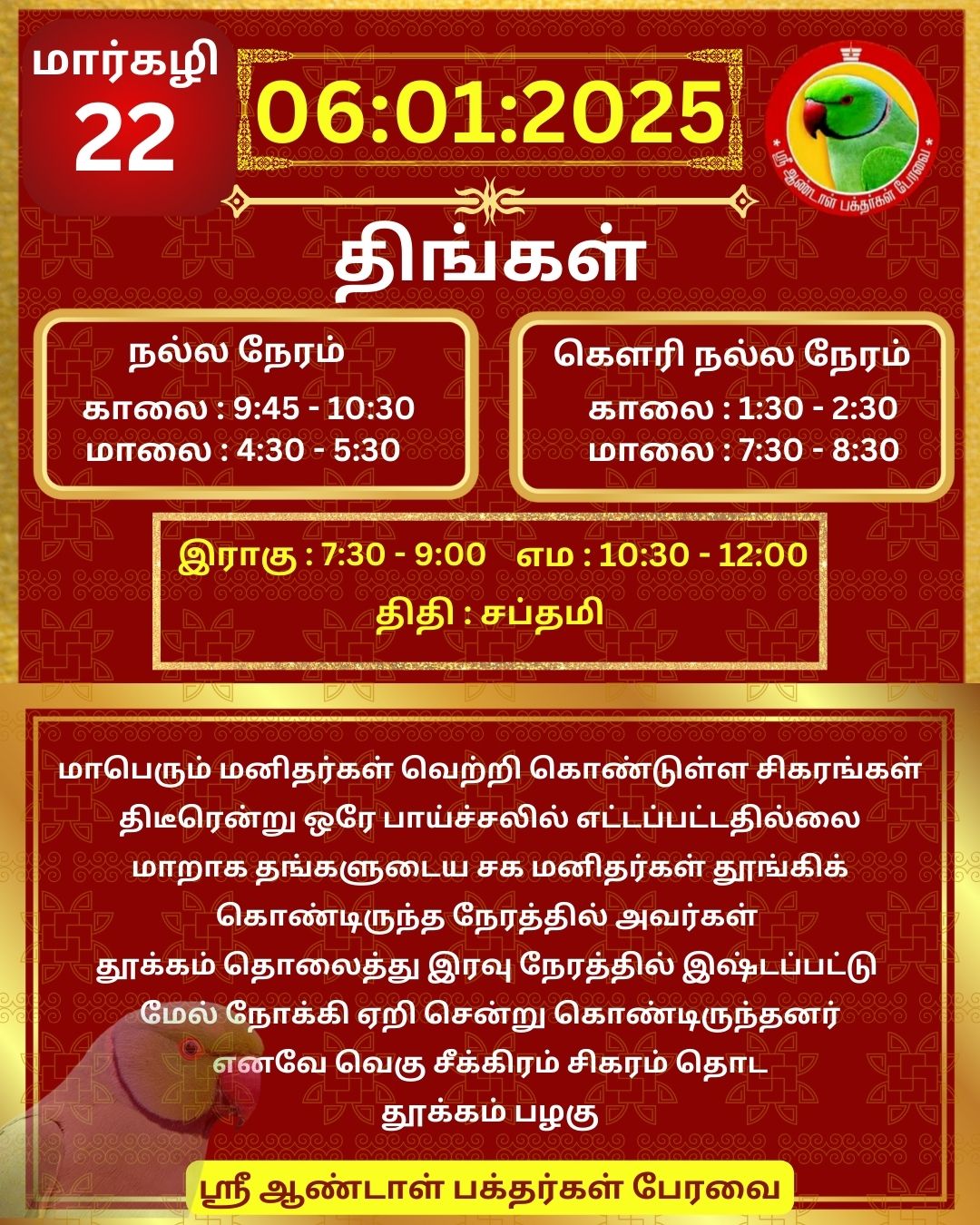 January 07 2025 0CommentSABP Posted by Vastu_Shastram In motivation SABPShare this: Tags: #daily_calender, APC, Calendar, calendar 2025, DAILY, DrAndalPChockalingam, Motivation, motivational quotes, motivational quotes daily, motivationalquotesoftheday, panjangam, SABP, SriAndalBakthargalPeravai, waytosuccess2025, ஆண்டாள், இன்றையநாள், காலண்டர், காலண்டர்2025, தன்னம்பிக்கை, தன்னம்பிக்கை2025, நாட்காட்டி, பஞ்சாங்கம், வாழ்கவளமுடன், ஸ்ரீஆண்டாள்பக்தர்கள்பேரவை Share: