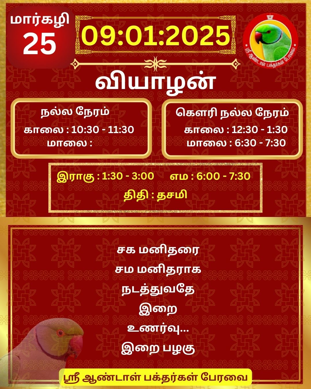 January 09 2025 0CommentSABP Posted by Vastu_Shastram In motivation SABPShare this: Tags: #daily_calender, APC, Calendar, calendar 2025, DAILY, DrAndalPChockalingam, Motivation, motivational quotes, motivational quotes daily, motivationalquotesoftheday, panjangam, SABP, SriAndalBakthargalPeravai, waytosuccess2025, ஆண்டாள், இன்றையநாள், காலண்டர், காலண்டர்2025, தன்னம்பிக்கை, தன்னம்பிக்கை2025, நாட்காட்டி, பஞ்சாங்கம், வாழ்கவளமுடன், ஸ்ரீஆண்டாள்பக்தர்கள்பேரவை Share: