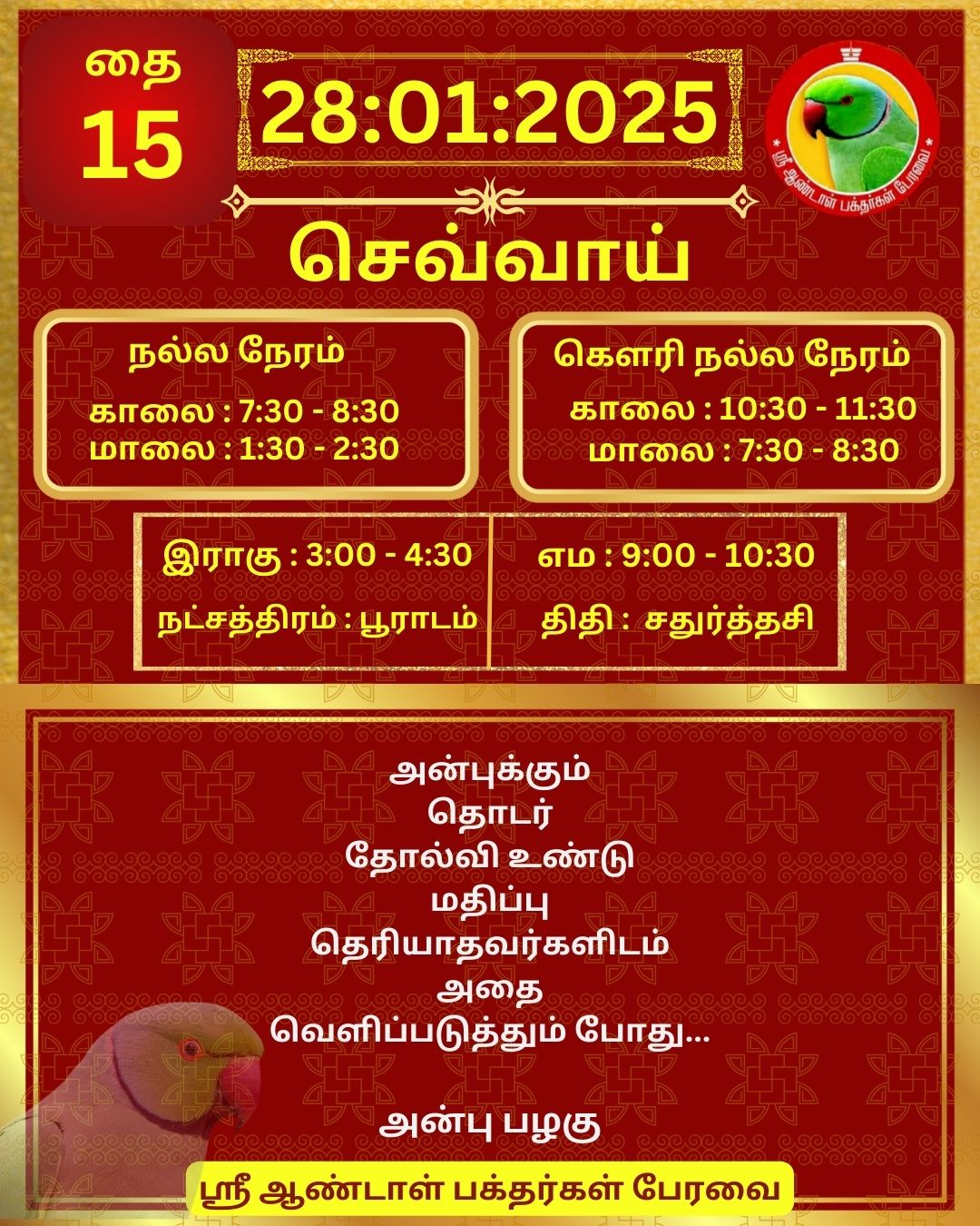 January 28 2025 0CommentSABP Posted by Vastu_Shastram In motivation SABPShare this: Tags: #daily_calender, APC, Calendar, calendar 2025, DAILY, DrAndalPChockalingam, Motivation, motivational quotes, motivational quotes daily, motivationalquotesoftheday, panjangam, SABP, SriAndalBakthargalPeravai, waytosuccess2025, ஆண்டாள், இன்றையநாள், காலண்டர், காலண்டர்2025, தன்னம்பிக்கை, தன்னம்பிக்கை2025, நாட்காட்டி, பஞ்சாங்கம், வாழ்கவளமுடன், ஸ்ரீஆண்டாள்பக்தர்கள்பேரவை Share: