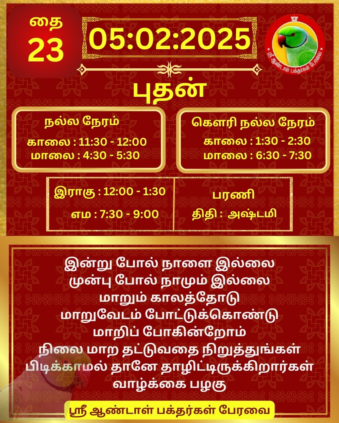 February 05 2025 0CommentSABP Posted by Vastu_Shastram In motivation SABPShare this: Tags: #daily_calender, APC, Calendar, calendar 2025, DAILY, DrAndalPChockalingam, Motivation, motivational quotes, motivational quotes daily, motivationalquotesoftheday, panjangam, SABP, SriAndalBakthargalPeravai, waytosuccess2025, ஆண்டாள், இன்றையநாள், காலண்டர், காலண்டர்2025, தன்னம்பிக்கை, தன்னம்பிக்கை2025, நாட்காட்டி, பஞ்சாங்கம், வாழ்கவளமுடன், ஸ்ரீஆண்டாள்பக்தர்கள்பேரவை Share: