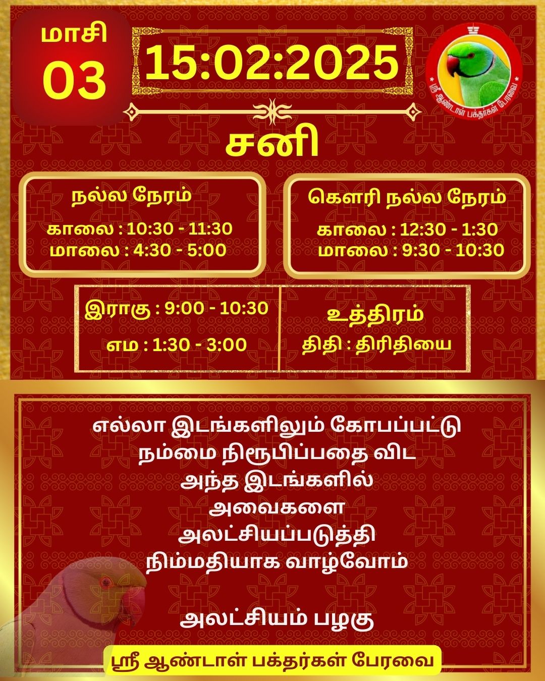 February 15 2025 0CommentSABP Posted by Vastu_Shastram In motivation SABPShare this: Tags: #daily_calender, APC, Calendar, calendar 2025, DAILY, DrAndalPChockalingam, Motivation, motivational quotes, motivational quotes daily, motivationalquotesoftheday, panjangam, SABP, SriAndalBakthargalPeravai, waytosuccess2025, ஆண்டாள், இன்றையநாள், காலண்டர், காலண்டர்2025, தன்னம்பிக்கை, தன்னம்பிக்கை2025, நாட்காட்டி, பஞ்சாங்கம், வாழ்கவளமுடன், ஸ்ரீஆண்டாள்பக்தர்கள்பேரவை Share: