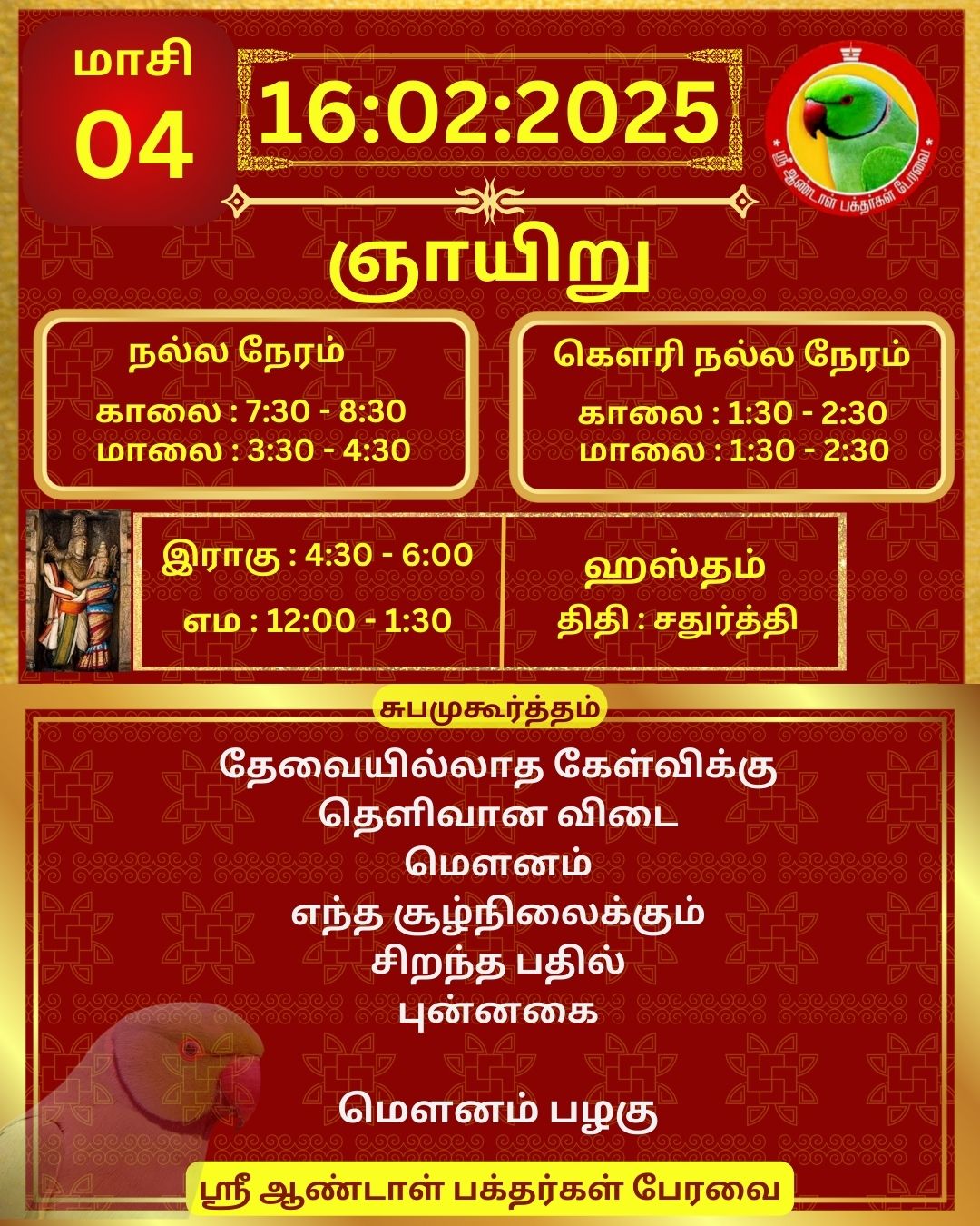 February 16 2025 0CommentSABP Posted by Vastu_Shastram In motivation SABPShare this: Tags: #daily_calender, APC, Calendar, calendar 2025, DAILY, DrAndalPChockalingam, Motivation, motivational quotes, motivational quotes daily, motivationalquotesoftheday, panjangam, SABP, SriAndalBakthargalPeravai, waytosuccess2025, ஆண்டாள், இன்றையநாள், காலண்டர், காலண்டர்2025, தன்னம்பிக்கை, தன்னம்பிக்கை2025, நாட்காட்டி, பஞ்சாங்கம், வாழ்கவளமுடன், ஸ்ரீஆண்டாள்பக்தர்கள்பேரவை Share: