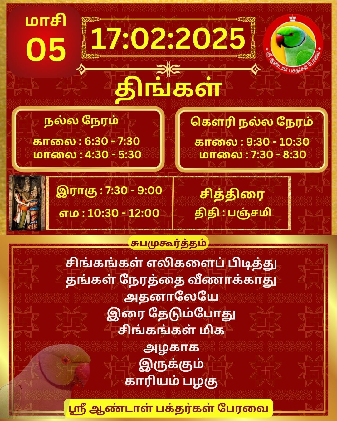February 17 2025 0CommentSABP Posted by Vastu_Shastram In motivation SABPShare this: Tags: #daily_calender, APC, Calendar, calendar 2025, DAILY, DrAndalPChockalingam, Motivation, motivational quotes, motivational quotes daily, motivationalquotesoftheday, panjangam, SABP, SriAndalBakthargalPeravai, waytosuccess2025, ஆண்டாள், இன்றையநாள், காலண்டர், காலண்டர்2025, தன்னம்பிக்கை, தன்னம்பிக்கை2025, நாட்காட்டி, பஞ்சாங்கம், வாழ்கவளமுடன், ஸ்ரீஆண்டாள்பக்தர்கள்பேரவை Share: