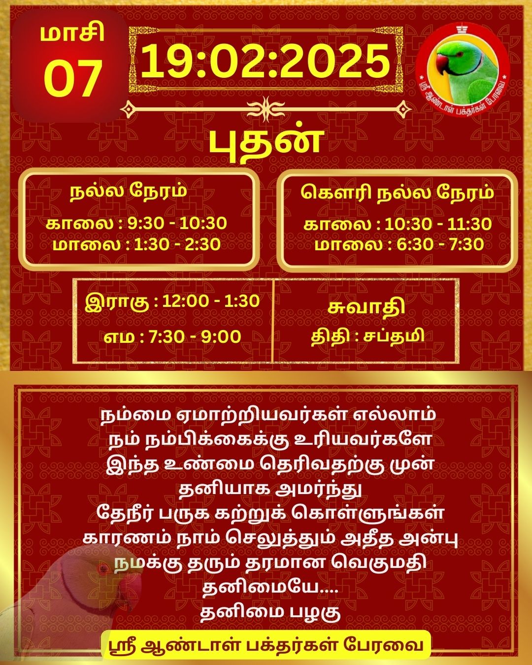 February 20 2025 0CommentSABP Posted by Vastu_Shastram In motivation SABPShare this: Tags: #daily_calender, APC, Calendar, calendar 2025, DAILY, DrAndalPChockalingam, Motivation, motivational quotes, motivational quotes daily, motivationalquotesoftheday, panjangam, SABP, SriAndalBakthargalPeravai, waytosuccess2025, ஆண்டாள், இன்றையநாள், காலண்டர், காலண்டர்2025, தன்னம்பிக்கை, தன்னம்பிக்கை2025, நாட்காட்டி, பஞ்சாங்கம், வாழ்கவளமுடன், ஸ்ரீஆண்டாள்பக்தர்கள்பேரவை Share: