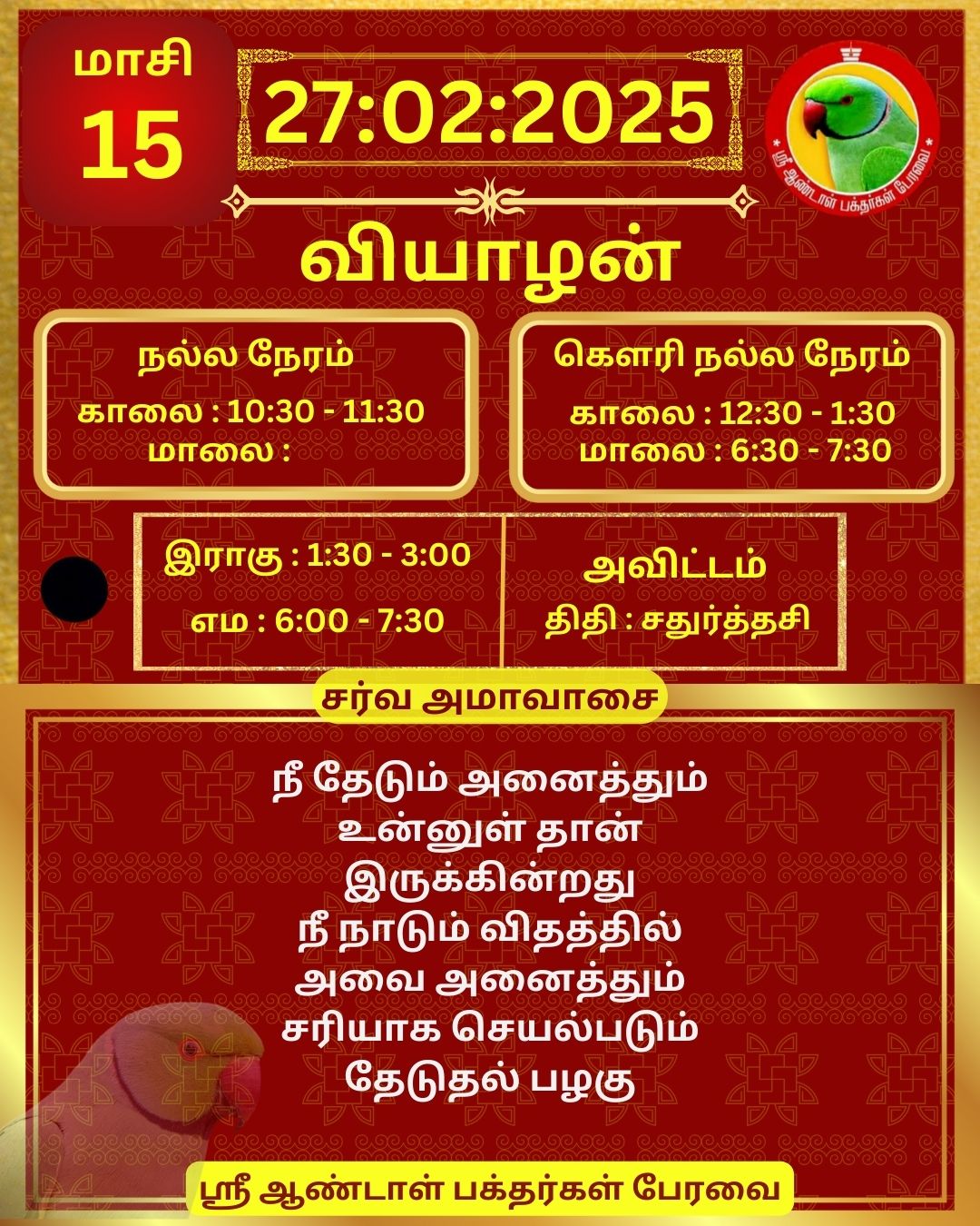 February 27 2025 0CommentSABP Posted by Vastu_Shastram In motivation SABPShare this: Tags: #daily_calender, APC, Calendar, calendar 2025, DAILY, DrAndalPChockalingam, Motivation, motivational quotes, motivational quotes daily, motivationalquotesoftheday, panjangam, SABP, SriAndalBakthargalPeravai, waytosuccess2025, ஆண்டாள், இன்றையநாள், காலண்டர், காலண்டர்2025, தன்னம்பிக்கை, தன்னம்பிக்கை2025, நாட்காட்டி, பஞ்சாங்கம், வாழ்கவளமுடன், ஸ்ரீஆண்டாள்பக்தர்கள்பேரவை Share: