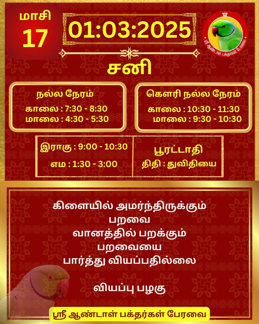 March 01 2025 0CommentSABP Posted by Vastu_Shastram In motivation SABPShare this: Tags: #daily_calender, APC, Calendar, calendar 2025, DAILY, DrAndalPChockalingam, Motivation, motivational quotes, motivational quotes daily, motivationalquotesoftheday, panjangam, SABP, SriAndalBakthargalPeravai, waytosuccess2025, ஆண்டாள், இன்றையநாள், காலண்டர், காலண்டர்2025, தன்னம்பிக்கை, தன்னம்பிக்கை2025, நாட்காட்டி, பஞ்சாங்கம், வாழ்கவளமுடன், ஸ்ரீஆண்டாள்பக்தர்கள்பேரவை Share: