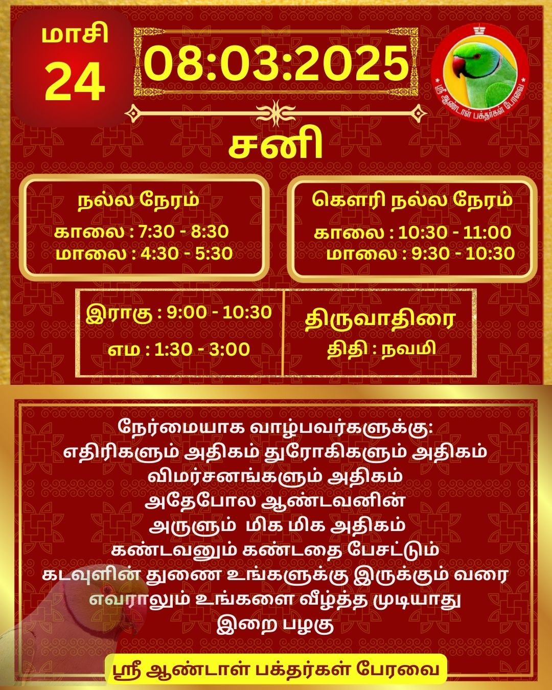 March 09 2025 0CommentSABP Posted by Vastu_Shastram In motivation SABPShare this: Tags: #daily_calender, APC, Calendar, calendar 2025, DAILY, DrAndalPChockalingam, Motivation, motivational quotes, motivational quotes daily, motivationalquotesoftheday, panjangam, SABP, SriAndalBakthargalPeravai, waytosuccess2025, ஆண்டாள், இன்றையநாள், காலண்டர், காலண்டர்2025, தன்னம்பிக்கை, தன்னம்பிக்கை2025, நாட்காட்டி, பஞ்சாங்கம், வாழ்கவளமுடன், ஸ்ரீஆண்டாள்பக்தர்கள்பேரவை Share: