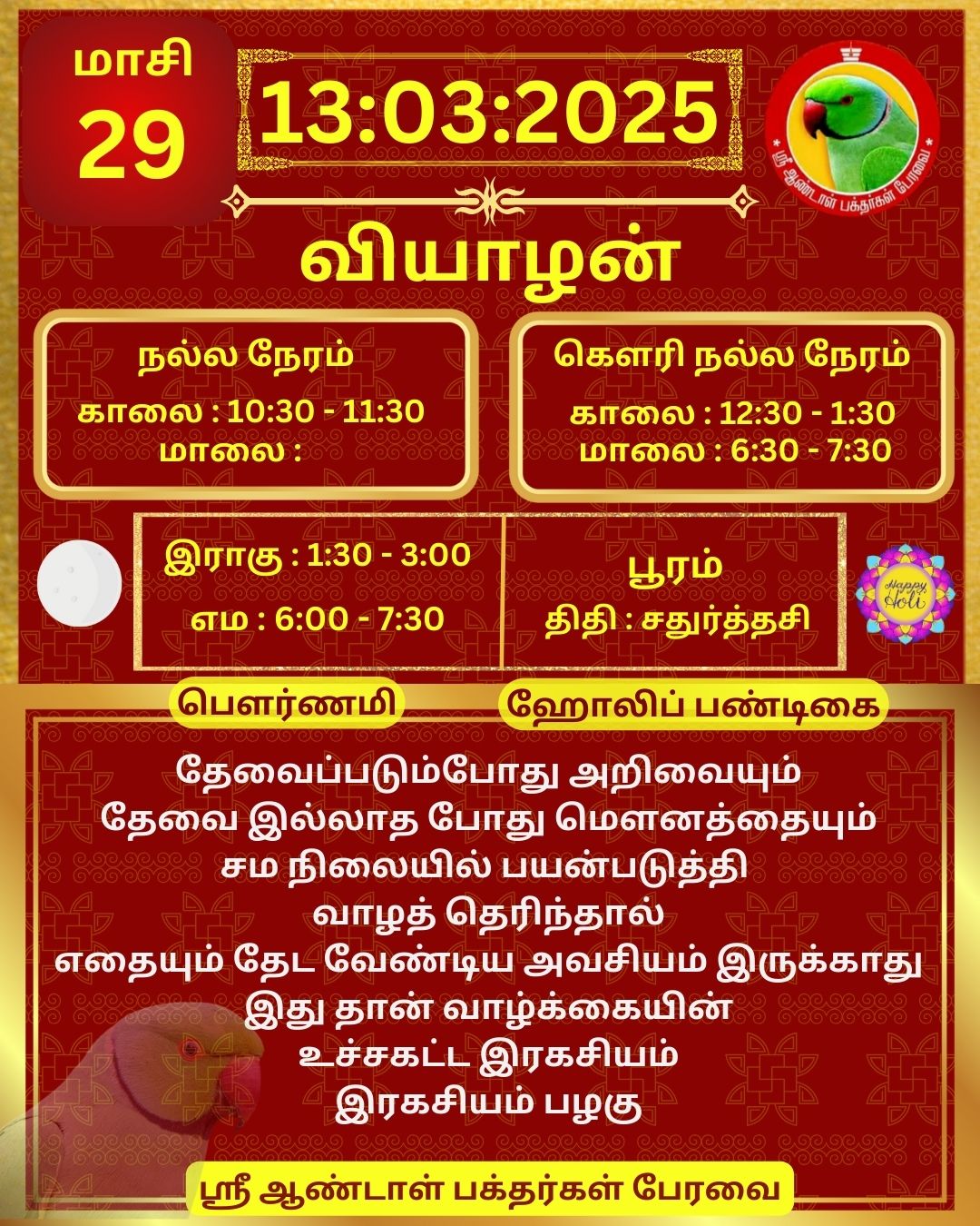 March 13 2025 0CommentSABP Posted by Vastu_Shastram In motivation SABPShare this: Tags: #daily_calender, APC, Calendar, calendar 2025, DAILY, DrAndalPChockalingam, Motivation, motivational quotes, motivational quotes daily, motivationalquotesoftheday, panjangam, SABP, SriAndalBakthargalPeravai, waytosuccess2025, ஆண்டாள், இன்றையநாள், காலண்டர், காலண்டர்2025, தன்னம்பிக்கை, தன்னம்பிக்கை2025, நாட்காட்டி, பஞ்சாங்கம், வாழ்கவளமுடன், ஸ்ரீஆண்டாள்பக்தர்கள்பேரவை Share: